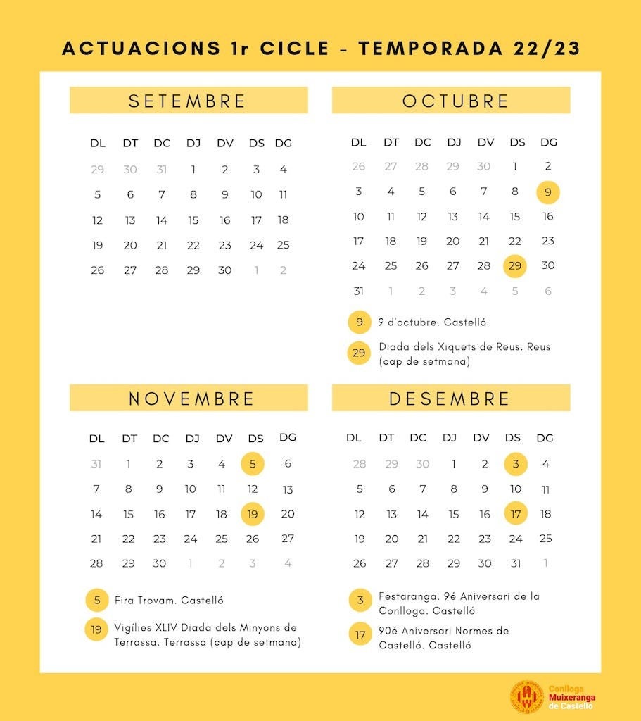 El primer cicle muixeranguer començarà el 9 d’Octubre a la capital de la Plana i finalitzarà en l’Aniversari de les Normes del 32, el 17 de desembre. Entremig, farà dues eixides a places històriques castelleres, ja que actuaran a les diades dels Xiquets de Reus i dels Minyons de Terrassa, colles punteres a Catalunya.