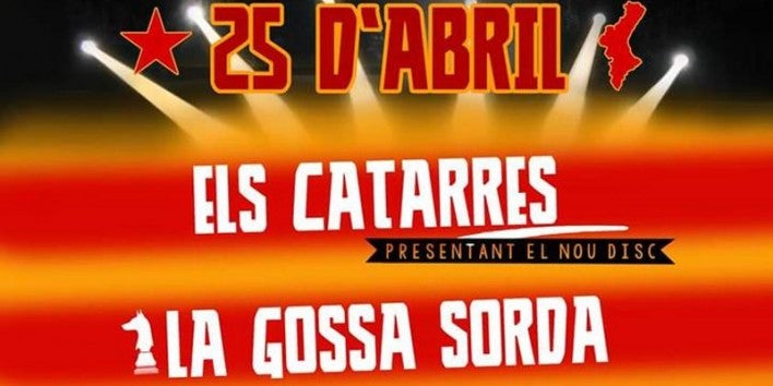 La Diada del 25 d’abril d’enguany al País Valencià ja té cartell. La ‘Festa pel canvi’ constarà d’una mobilització i un concert en què ja s’ha avançat que actuaran el grup català Els Catarres i els valencians La Gossa Sorda, així com els Traficants del Sucre