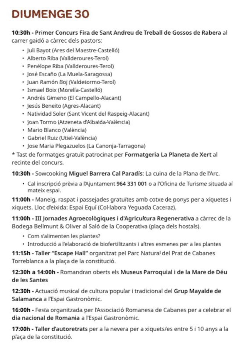 També hi haurà: una exhibició culinària del xef Miguel Barrera, d’Estrella Michelin; passejades gratuïtes en cotxes de ponis per al públic infantil; les III Jornades Agroecològiques i d’Agricultura Regenerativa, a partir de les 11 h; i, a la vesprada, la celebració del Dia Nacional de Romania, a càrrec de l’Associació Romanesa de Cabanes.