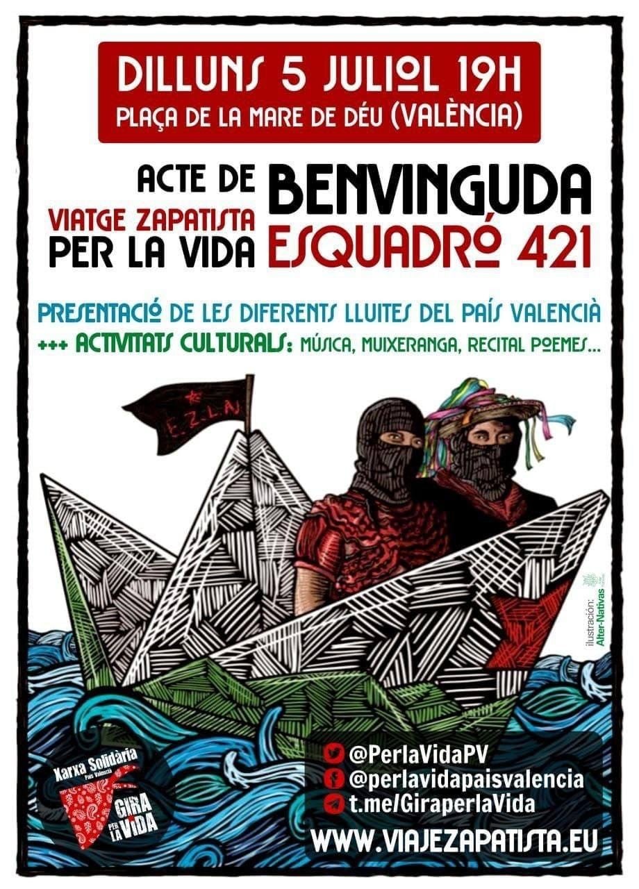 L’Esquadró 421 de l’Exèrcit Zapatista d’Alliberament Nacional (EZLN) ha arribat aquest dilluns a València (tal com es pot veure en aquest reportatge fotogràfic) després que desembarcara a la platja d’Alcabre de Vigo, a Galícia, el passat 22 de juny, i haja passat per Mèrida i Madrid. La delegació zapatista, que va salpar dos mesos abans des del port d’Isla Mujeres, a Mèxic, a bord d’un vaixell alemany rebatejat com La Montaña, «una muntanya navegant a repèl de la història», durà a terme una gira per una trentena de països europeus «per compartir les seues experiències rebels i intentar reactivar la lluita anticapitalista al Vell Continent». Està integrada per quatre dones, dos homes i una persona de gènere no binari.