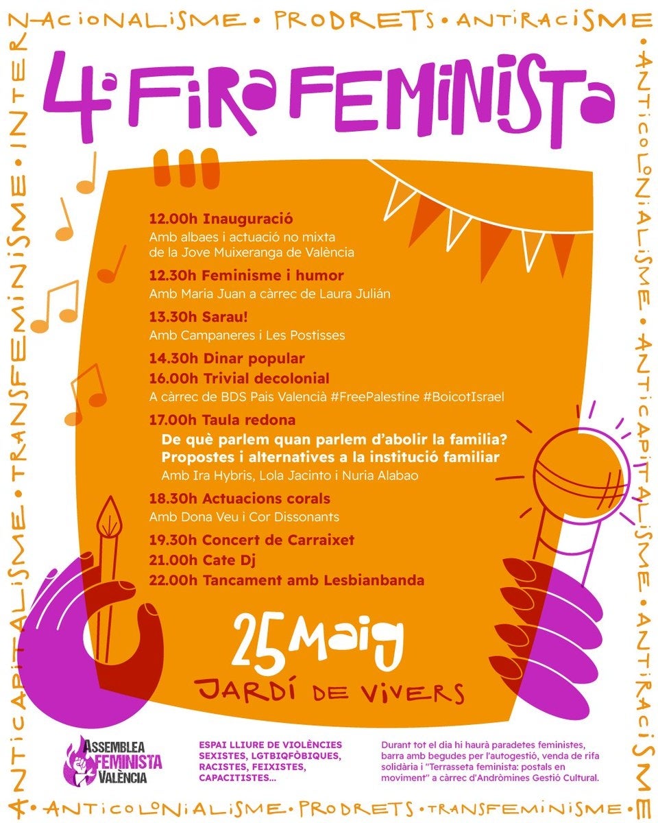 Així, d’una banda, a les 12.30 hores, la periodista Laura Julian entrevistarà la humorista Maria Juan, sobre com es relacionen feminisme i comèdia. La conversa anirà seguida d’un tast d’humor per part de la còmica valenciana. I a les 17 h tindrà lloc una xarrada que abordarà les crítiques a la institució familiar des de les perspectives anticapitalistes, antiracistes i transfeministes. Hi participaran com a ponents les activistes Ira Hybris, Nuria Alabao i Dolores Jacinto.