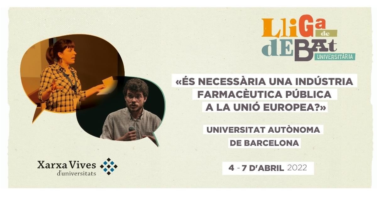 La Lliga de Debat Universitària de la Xarxa Vives discutirà sobre la necessitat de crear una farmacèutica pública en la seua edició del 2022. La principal lliga de debat de l’àmbit universitari recuperarà la presencialitat en l’edició d’enguany després del format virtual de 2021 a causa de les restriccions per la COVID-19. La competició d’oratòria, que està adreçada a l’estudiantat de les universitats de la Xarxa Vives, tindrà lloc del 4 al 7 d’abril a la