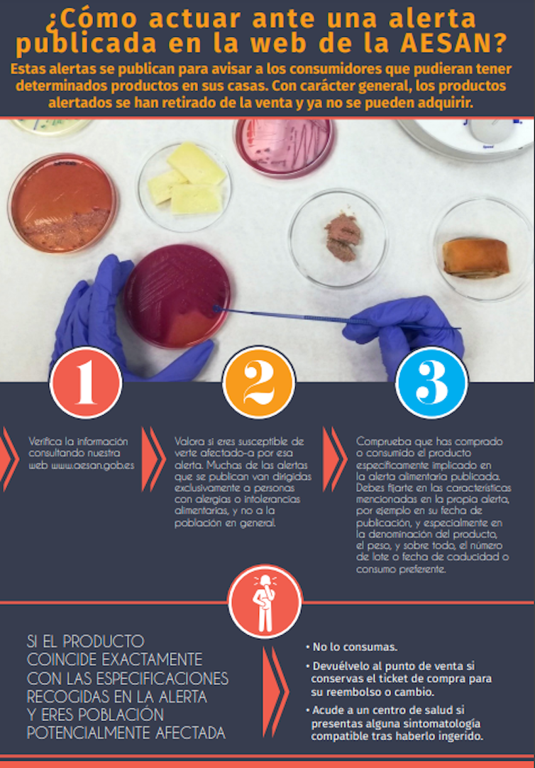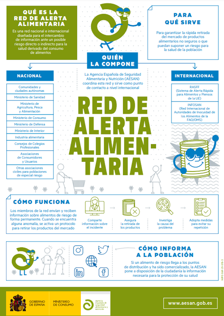 Ací convé recordar que a Espanya la seguretat alimentària i la promoció de la nutrició saludable es troben en mans d’un mecanisme clau com és l’Agència Espanyola de Seguretat Alimentària i Nutrició (AESAN). Aquesta entitat actua com a punt de contacte de tres xarxes d’alerta, a escala espanyola, europea i mundial.