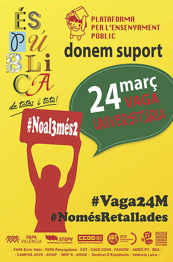 Així doncs, la Plataforma en defensa de l’Ensenyament Públic fa una crida a tota la comunitat educativa, AMPA, professorat, alumnat, equips directius i personal no docent a eixir al carrer el pròxim 24 de març i manifestar el rebuig a aquestes mesures.