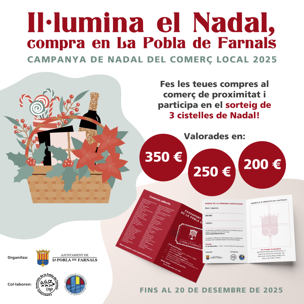 L’Ajuntament de la Pobla de Farnals (l’Horta Nord), a través de la regidoria de Comerç i amb la col·laboració de les associacions de comerciants del municipi, ha llançat la campanya “Il·lumina Nadal, compra en la Pobla de Farnals”, fins al 20 de desembre. L’objectiu de la iniciativa és incentivar les compres en el comerç local durant el període nadalenc i posar en valor el teixit comercial de la localitat.