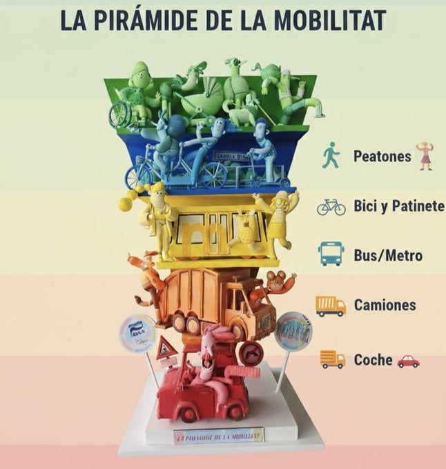 La Falla municipal infantil del 2026 serà una “piràmide de la mobilitat”. Un ninot que a l’estil dels triangles de l’alimentació saludable mostra quins tipus de mobilitat s’han de prioritzar en els trajectes quotidians, tant per a una major fluïdesa com per les conseqüències ambientals o en la salut. Es comença per caminar sempre que es puga, utilitzar la bicicleta o el patinet en distàncies un poc més llargues, se segueix pel transport públic i s’acaba, només en els casos imprescindibles per fer ús dels vehicles privats. Veient la proposta de monument, es podria pensar que algun artista faller li ha “colat” un gol a l’actual equip de govern municipal, ja que pareix realment la recepta exactament contrària al que estan aplicant des de l’entrada de María José Catalá a l’alcaldia el 2023.