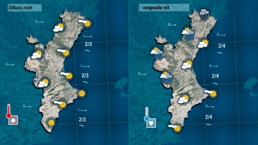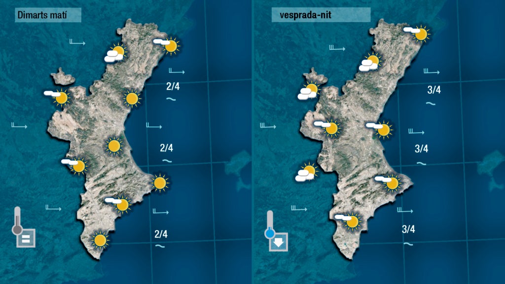 Al nord del País Valencià, el ponent mantindrà les temperatures altes durant tota la jornada de hui, amb màximes que rondaran els 28-30 graus. A última hora del dia, l’arribada d’un front deixarà el cel més ennuvolat i podrien registrar-se alguns ruixats dèbils, especialment a l’interior. Demà dimarts, el vent de ponent continuarà bufant, però els núvols seran menys compactes i les temperatures començaran a baixar lleugerament.