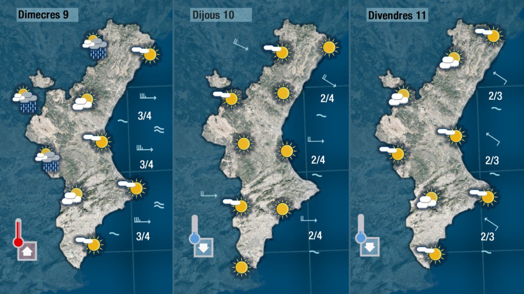 Per al 9 d’octubre, les previsions indiquen un dia de ponent amb temperatures altes i el pas de núvols. No s’esperen grans pluges, però a última hora de la jornada podrien caure alguns ruixats dèbils. Dijous serà un dia assolellat, i serà l’últim dia amb vent de ponent, ja que divendres el vent girarà a llevant i xaloc, portant un descens tèrmic més marcat. Tot apunta que divendres podria ser el dia en què comencem a buscar els paraigües, amb pluges que podrien estendre’s durant el cap de setmana.