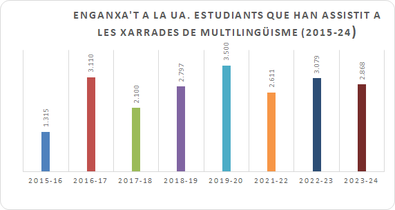 El programa “Enganxa’t a la UA. Enganxa’t al futur” concentra enguany una part destacada d’aquesta estratègia. El Servei de Llengües ofereix xarrades informatives gratuïtes als instituts de secundària perquè l’alumnat conega les opcions de docència en valencià, anglés i altres llengües a la UA. El Voluntariat Lingüístic, format per més de 300 estudiants, assumeix el lideratge de les sessions, que s’adrecen a 4t d’ESO i 1r i 2n de Batxillerat i s’imparteixen en valencià, en grups reduïts.