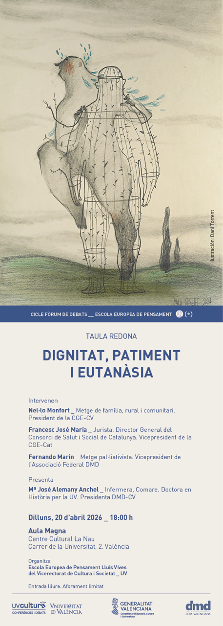 L’Aula Magna del Centre Cultural La Nau de la Universitat de València acollirà el 20 d’abril, a les 18 h, una taula redona sobre el final de la vida titulada “Dignitat, Patiment i Eutanàsia“. L’acte, organitzat per l’associació Dret a Morir Dignament (DMD) al País Valencià, dins del marc del cicle Fòrum de Debats de l’Escola Europea de Pensament Lluís Vives, pretén generar un espai de reflexió col·lectiva al voltant d’una qüestió que continua generant debat social, jurídic i sanitari.