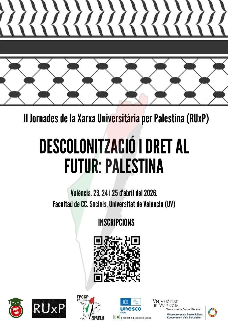 Amb el títol “Descolonització i dret al futur: Palestina”, la Universitat de València (UV) acollirà entre dijous i dissabte les II Jornades de la Xarxa Universitària per Palestina, que ja s’han convertit en la principal cita per a la denúncia del genocidi i el sistema d’apartheid executat per Israel arreu de l’estat espanyol.