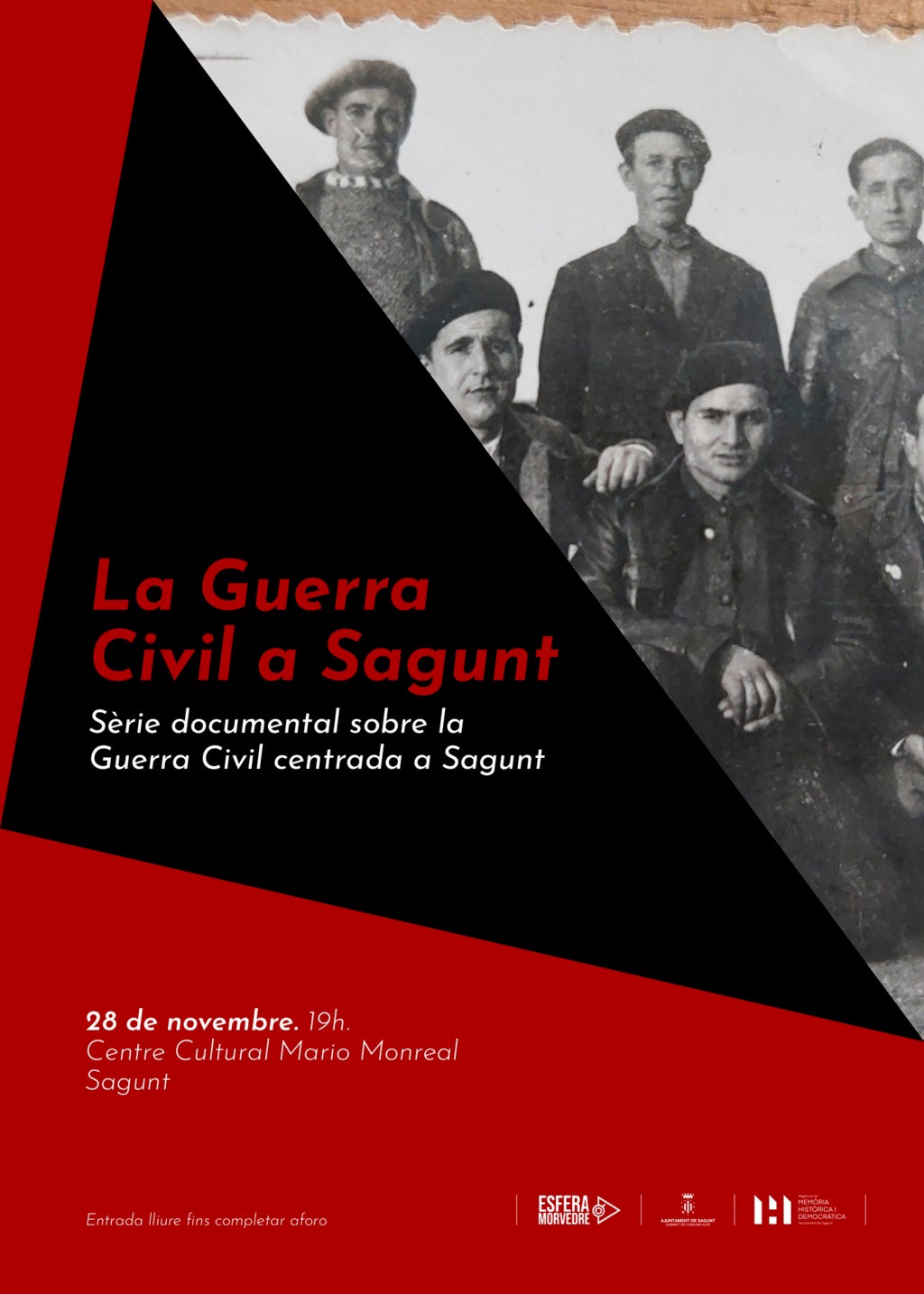 L’Ajuntament de Sagunt (Camp de Morvedre) presenta la sèrie documental La Guerra Civil a Sagunt, coproduïda per l’associació Esfera Morvedre junt amb la regidoria de Memòria Històrica i Democràtica, que l’ha finançada, i el Gabinet de Comunicació, que s’ha encarregat de la part tècnica. L’acte tindrà lloc el 28 de novembre a les 19:00 al Centre Cultural Mario Monreal, on es projectarà el primer capítol.