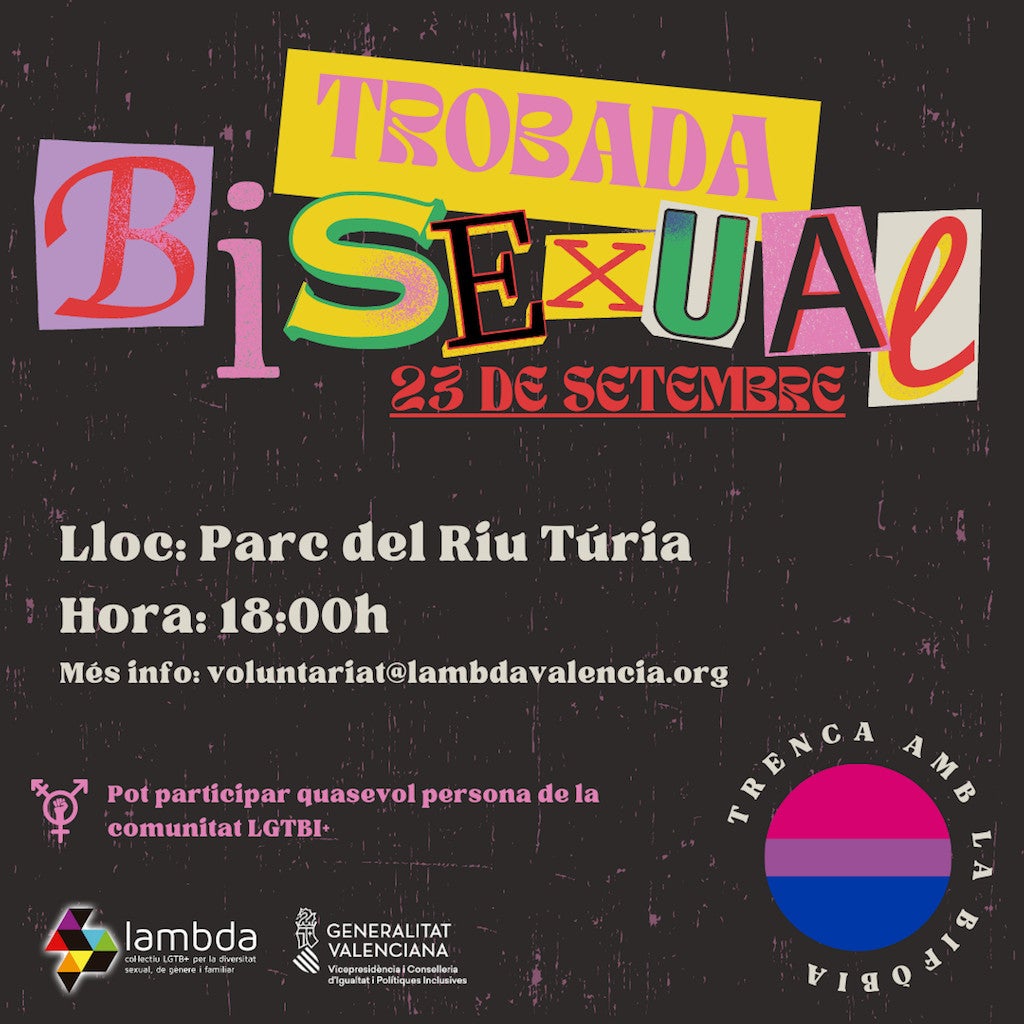 Lambda, col·lectiu LGTB+ per la diversitat sexual, de gènere i familiar, organitza una trobada amb activistes LGTBI+ aquest divendres, 23 de setembre, Dia de la visibilitat bisexual, a les 18 h, al Parc del Túria de València, amb l’objectiu de combatre els mites estesos al voltant de la bisexualitat, una de les opcions encara més desconegudes, fins i tot dins del mateix col·lectiu.