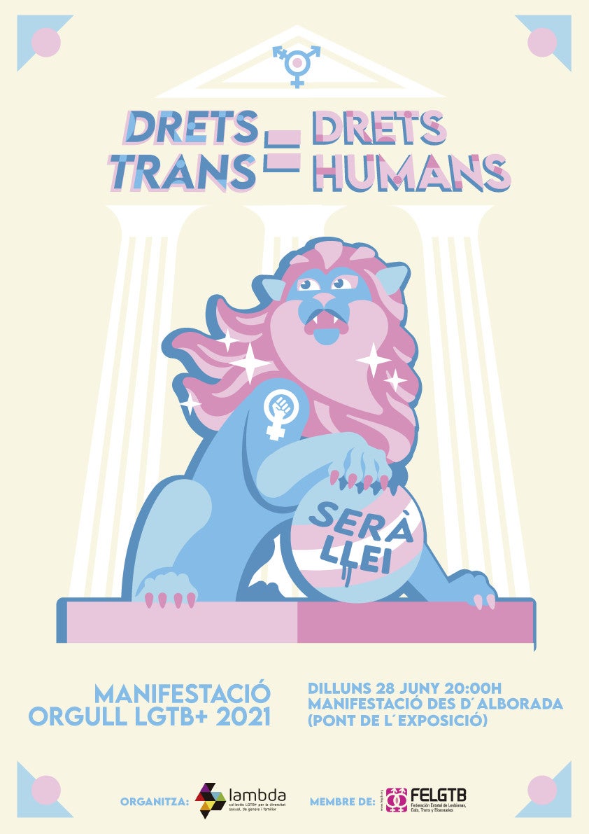 En aquest sentit, la imatge del cartell de l’Orgull LGTB+ 2021 representa la lleona del Congrés dels Diputats amb els colors de la bandera trans, en clara al·lusió a la necessitat d’aprovar una llei trans estatal amb urgència. «Les persones trans no podem continuar esperant. Necessitem que els nostres drets siguen reconeguts amb urgència perquè estem fartes de ser ciutadania de segona classe», insisteix la coordinadora del GATT.