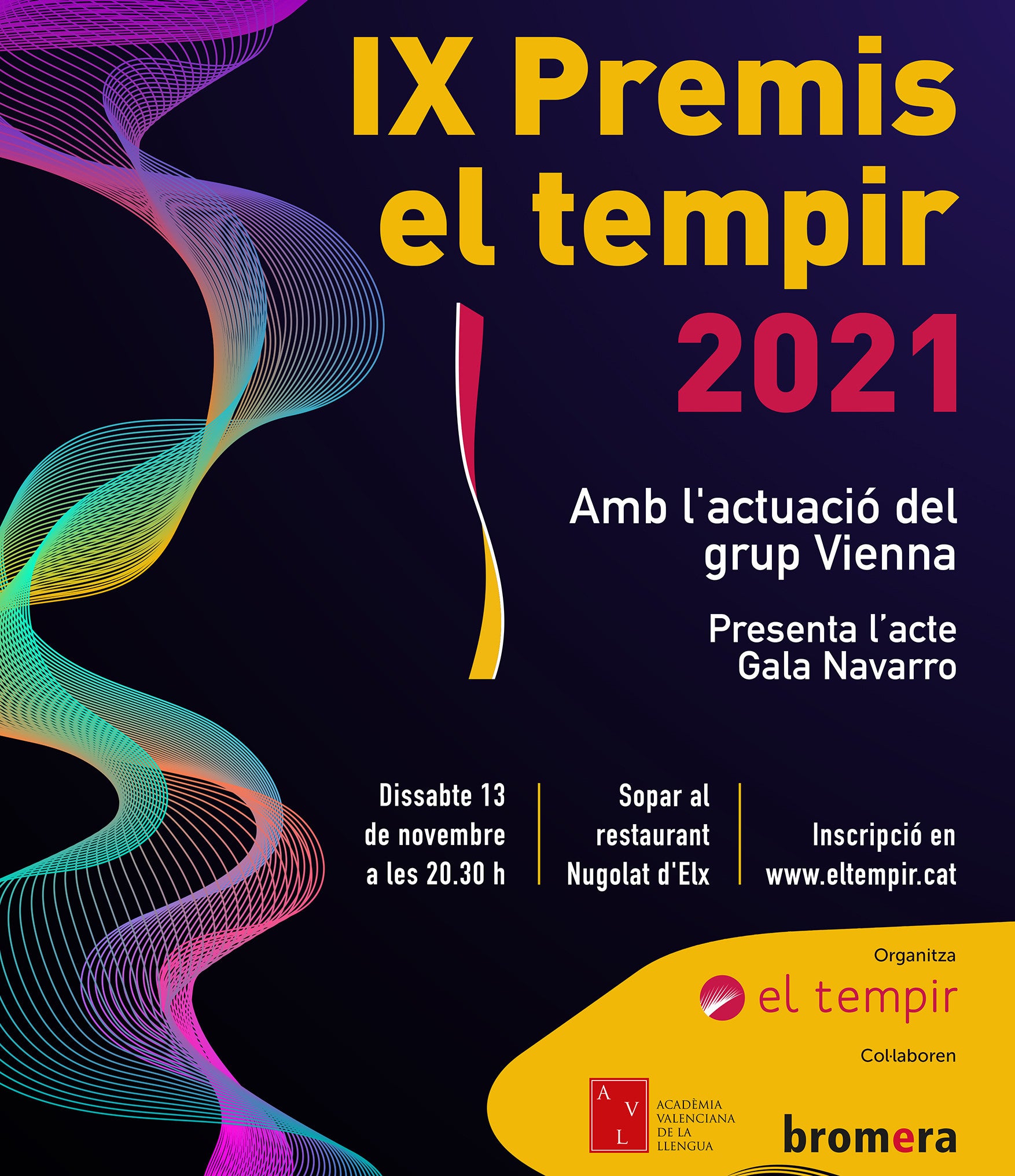 Enguany, l’acte de lliurament dels Premis El Tempir tindrà lloc aquest dissabte, 13 de novembre, al restaurant el Nugolat d’Elx i serà conduït per Gala Navarro, periodista d’À Punt. A més, hi actuarà un grup jove del sud, els Vienna, que fa un pop mediterrani, tot i que la seua producció també té tocs indie, funk i reggaeton. Els guardonats rebran com a reconeixement una escultura dissenyada i realitzada per l’artista elxà Antoni Pons.