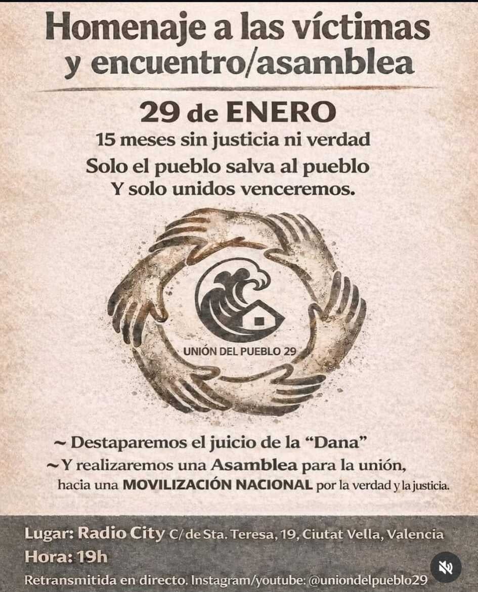 Ara, l’Associació “Unión del Pueblo 29”, presidida per la mateixa Garrido, ha convocat un homenatge a les víctimes i un “encontre/assemblea” pel pròxim 29 de gener -quan farà 15 mesos de la riuada- a Radio City, una associació cultural coneguda sobretot per la seua activitat de sala de festes, situada al centre de València i habitualment vinculada a entorns progressistes.