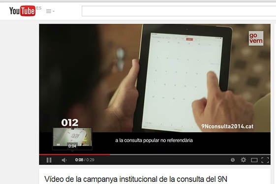 No obstant això, el canal de Youtube del Govern català conté encara el vídeo que informa de la convocatòria de la consulta del 9-N, pujat el 27 de setembre -des que el president de la Generalitat, Artur Mas, va signar el decret de convocatòria dissabte al matí- i que compta amb més de 2.500 visualitzacions.