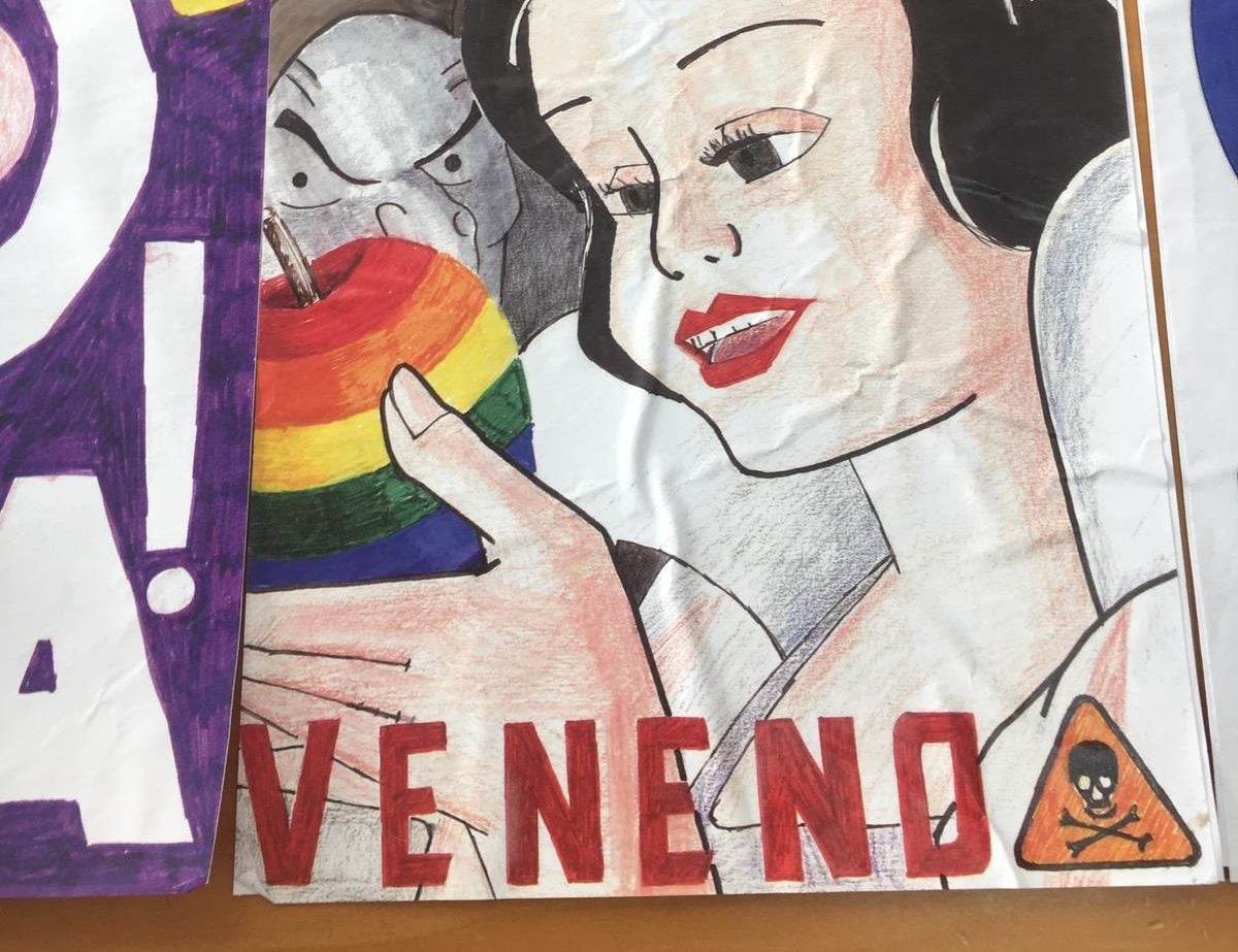 En una de les imatges penjades al perfil de l’Observatori es veu la imatge de Blancaneu amb una poma pintada amb els colors de l’arc de Sant Martí i un cartell amb la paraula ‘veneno‘. En l’altra imatge, un drac simula tirar foc –també amb els colors de l’arc de Sant Martí– sobre una família normativa o tradicional que es refugia dins d’una església.