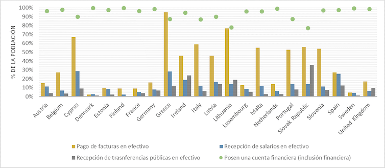 A l’extrem superior se situa Grècia, país en què un 95,4% de la població fa aquest tipus de pagaments en efectiu. A l’extrem contrari es troba Dinamarca, on tan sols un 2,1% de la població usa efectiu per al pagament de factures. Aquestes dues dades posen de manifest la gran heterogeneïtat entre països.