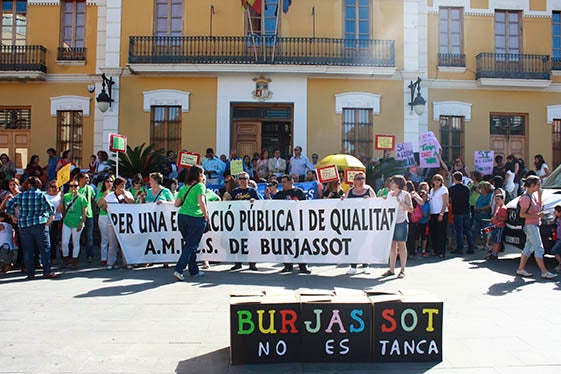 Les protestes es van unificar en la vesprada d’ahir amb una manifestació que va congregar, a les 17h, s la plaça de l’Ajuntament, les comunitats educatives dels dos centres escolars, el col·lectiu d’AMPAS de Burjassot, representants de FAPA VALÈNCIA (Federació d’Associacions de Pares d’Alumnes de València), representants d’altres centres educatius de Burjassot i els representants polítics de l’Ajuntament de Burjassot, encapçalats per l’Alcalde, Rafa García que va assistir acompanyat de la regidora d’Educació, Adela Pérez, els regidors Manuel Pérez Menero, Emili Altur, Olga Camps i Lluna Àrias.