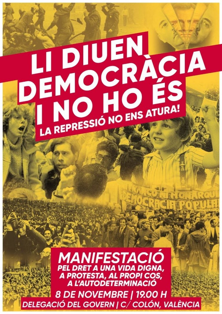 Més de 70 organitzacions s’han adherit a la manifestació contra la repressió que tindrà lloc el pròxim divendres 8 de novembre a les 19.00 davant l’antiga Delegació del Govern (C/Colón, València).