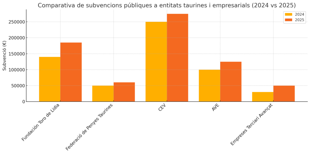 El pressupost de la Generalitat Valenciana per a l’any 2025 inclou un increment de 245.000 euros en subvencions directes i nominatives a entitats taurines i organitzacions empresarials. Segons una anàlisi de Diari La Veu del País Valencià a partir dels annexos oficials del pressupost (T8), les quantitats destinades a aquestes entitats passen dels 320.000 euros pressupostats en 2024 als 565.000 euros previstos en 2025, cosa que representa un augment del 76%.