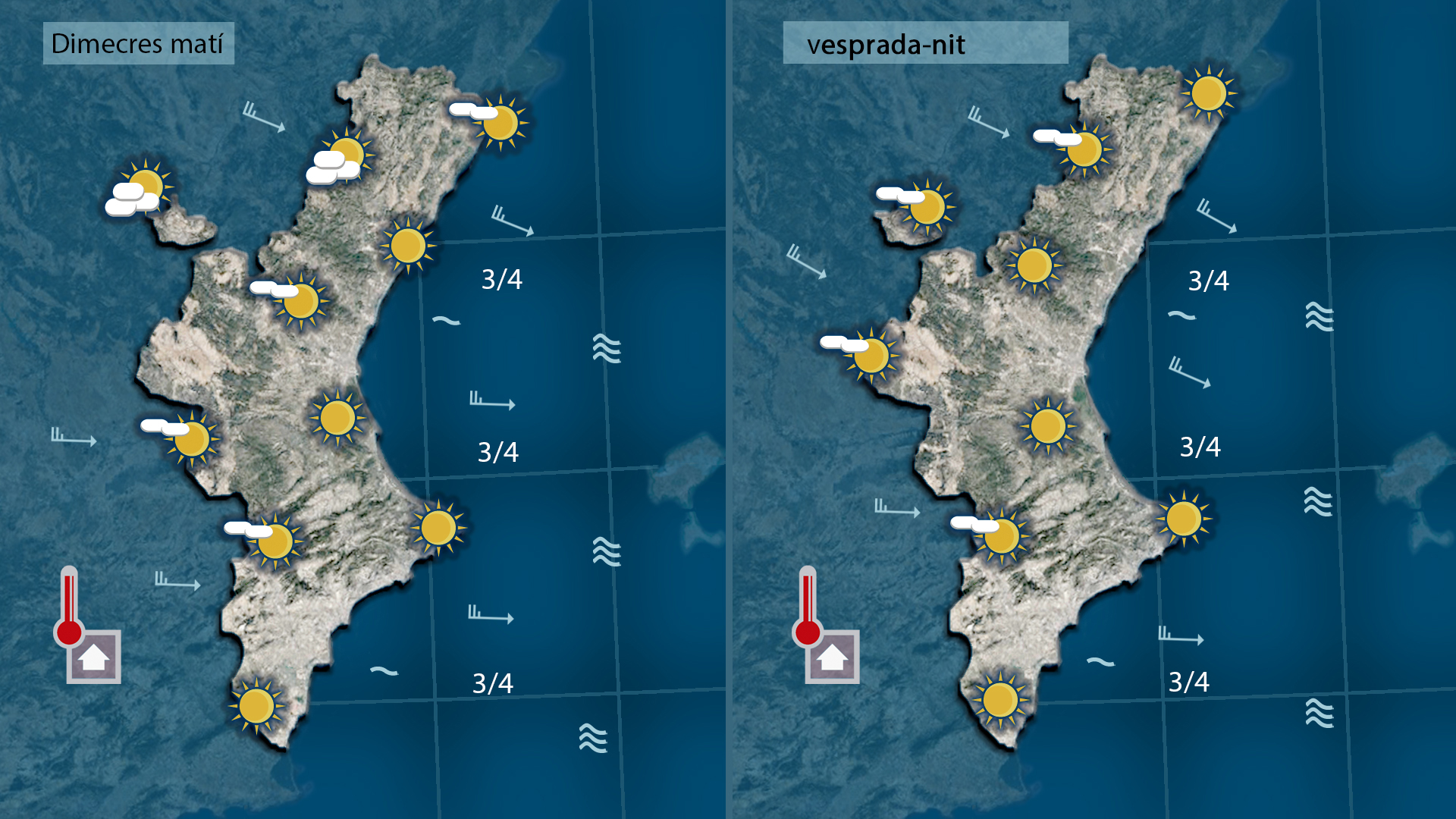 A primera hora encara bufa mestral al nord i ponent al centre i al sud, amb alguna ratxa moderada. Cap a migdia encalmarà i fins i tot podria girar puntualment a sud-est, però no serà un canvi definitiu, ja que durant la nit i matinada tornarà a imposar-se el ponent.