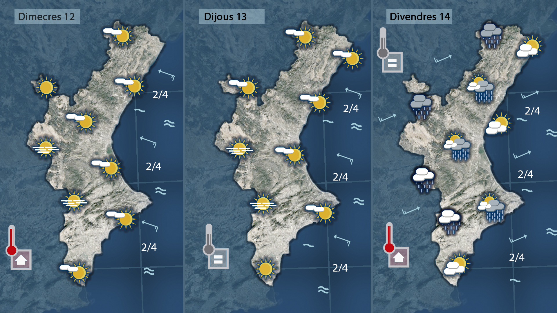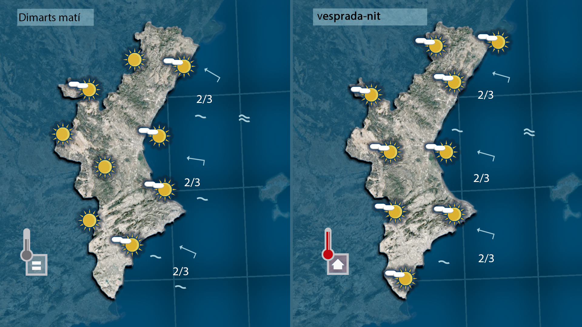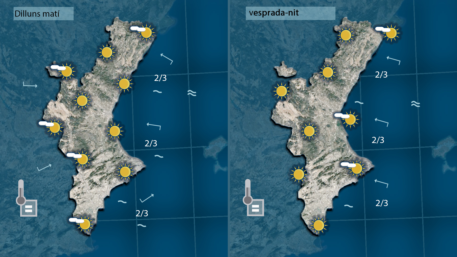 El ponent encara podrà deixar-se sentir a primera hora del matí d’aquest dilluns, però ràpidament donarà pas al xaloc, que bufarà fluix. L’oratge serà estable, amb intervals de núvols prims i temperatures suaus que rondaran els 20-22 °C. Dimarts i dimecres dominaran les boirines i els cels enteranyinats, especialment a les valls interiors i les serres del nord. A partir de divendres, una nova entrada de ponent podria portar una davallada tèrmica i algun ruixat dispers, sobretot a l’Alt Palància i l’Alt Millars.