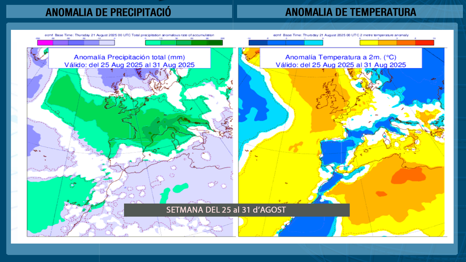 La setmana de tancament d’agost es preveu molt més suportable que les anteriors. Després d’un dilluns de ruixats irregulars, dimarts i dimecres portaran estabilitat i un augment moderat de temperatures. Dijous, una nova entrada d’inestabilitat podrà deixar tempestes al nord i centre, mentre que el ponent farà créixer els termòmetres divendres. El cap de setmana, segons els models, es mantindrà calorós, però ja sense la intensitat de les onades de calor de principis de mes.