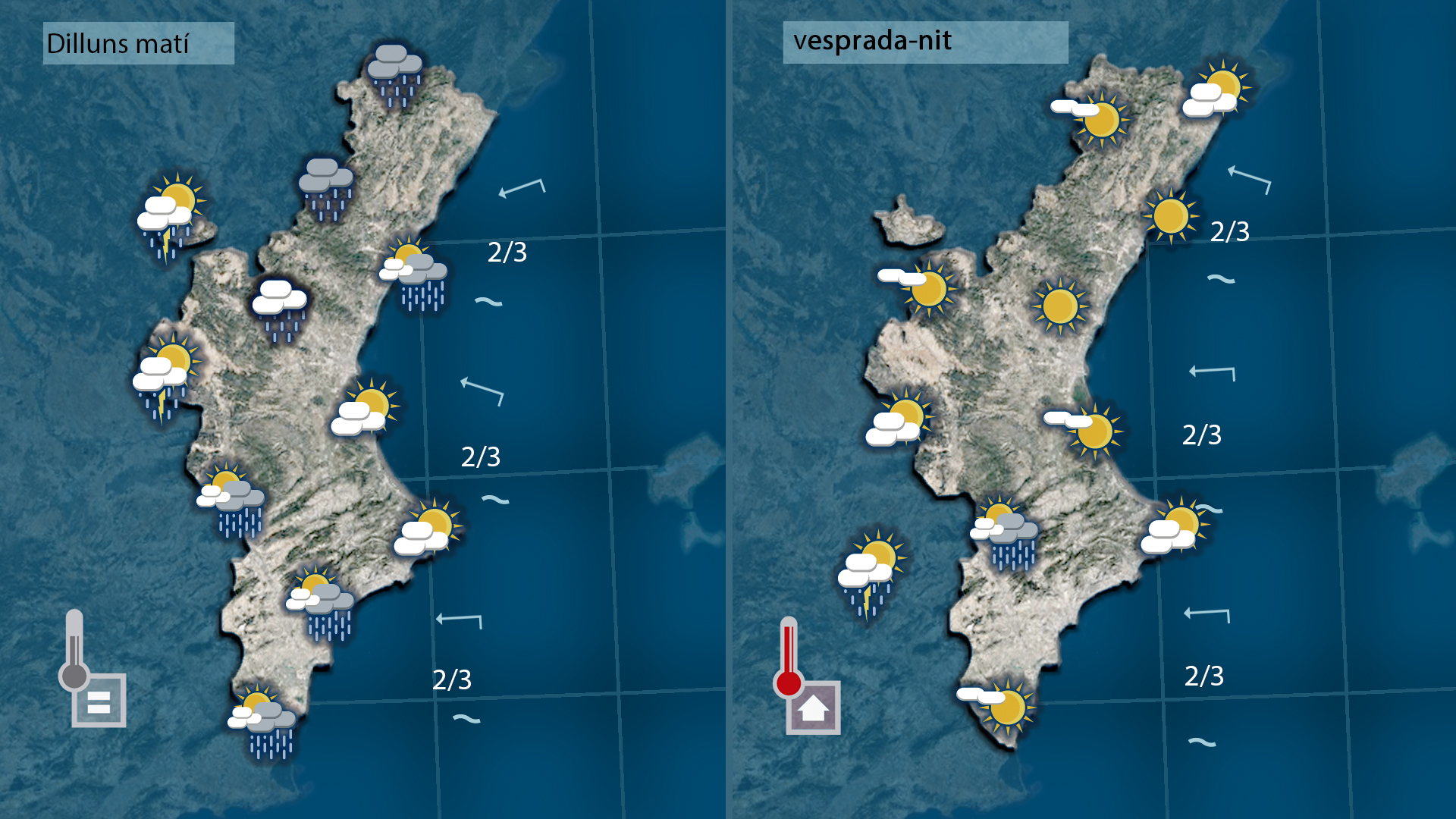 El nord del País Valencià enceta la setmana amb ruixats irregulars i alguns trons puntuals a les zones més interiors, com els Ports o l’Alt Millars. Les precipitacions aniran a menys tal com avance la jornada i la nit serà un poc més fresca. Dimarts i dimecres predominarà el sol, amb temperatures que tornaran a enfilar-se fins als 30-32 °C. Dijous s’esperen canvis: una línia d’inestabilitat portarà ruixats de vesprada, que podran ser localment intensos a l’Alcalatén i l’Alt Palància.