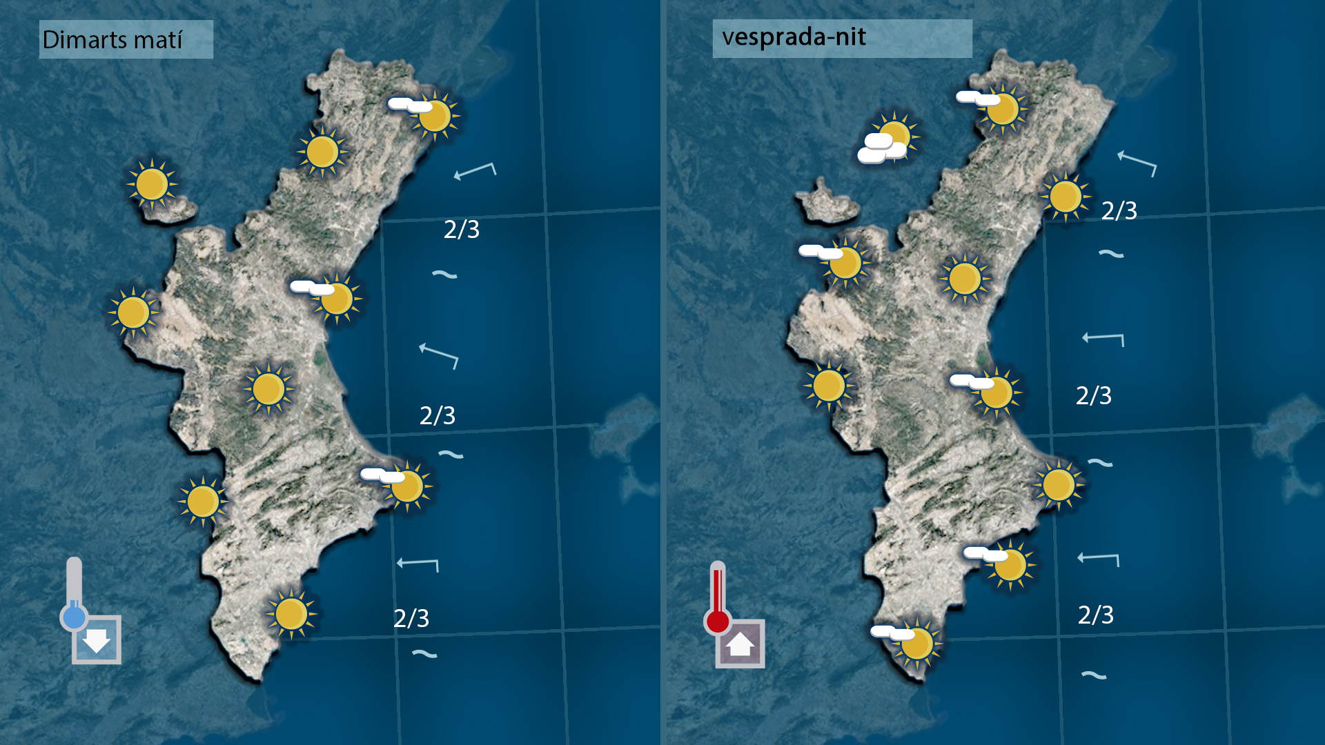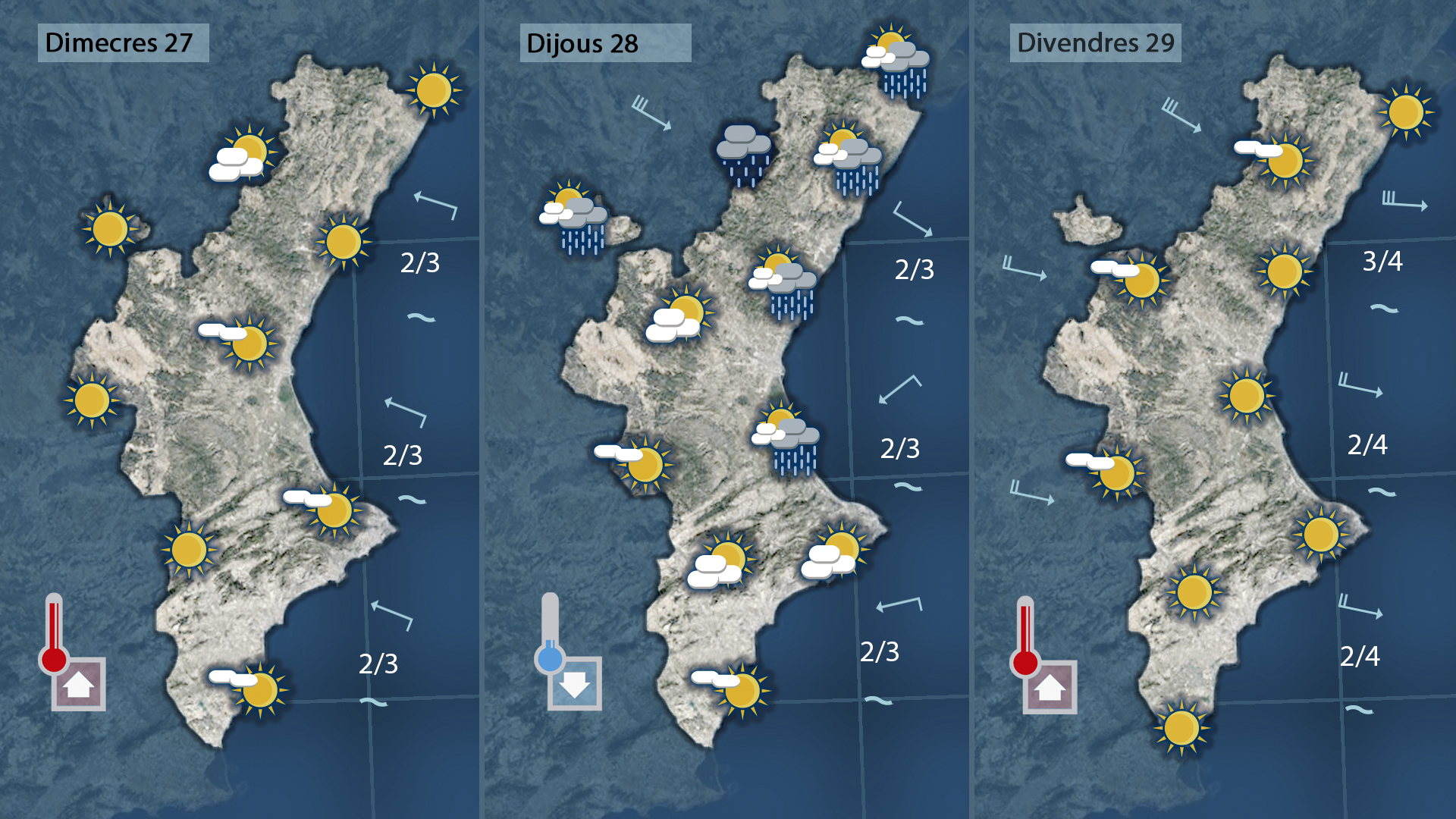 Al sud, la setmana comença amb ambient variable i algun ruixat dèbil que podria aparéixer fins a migdia, sobretot a l’Alcoià i l’interior del Vinalopó. Dimarts i dimecres, el temps serà estable i calorós, amb màximes de 33-34 °C a Oriola, Novelda o Elx, i amb nits encara càlides. Dijous, el ponent podria afavorir un ascens tèrmic i deixar una sensació de calor més seca, però sense descartar núvols d’evolució a l’interior.