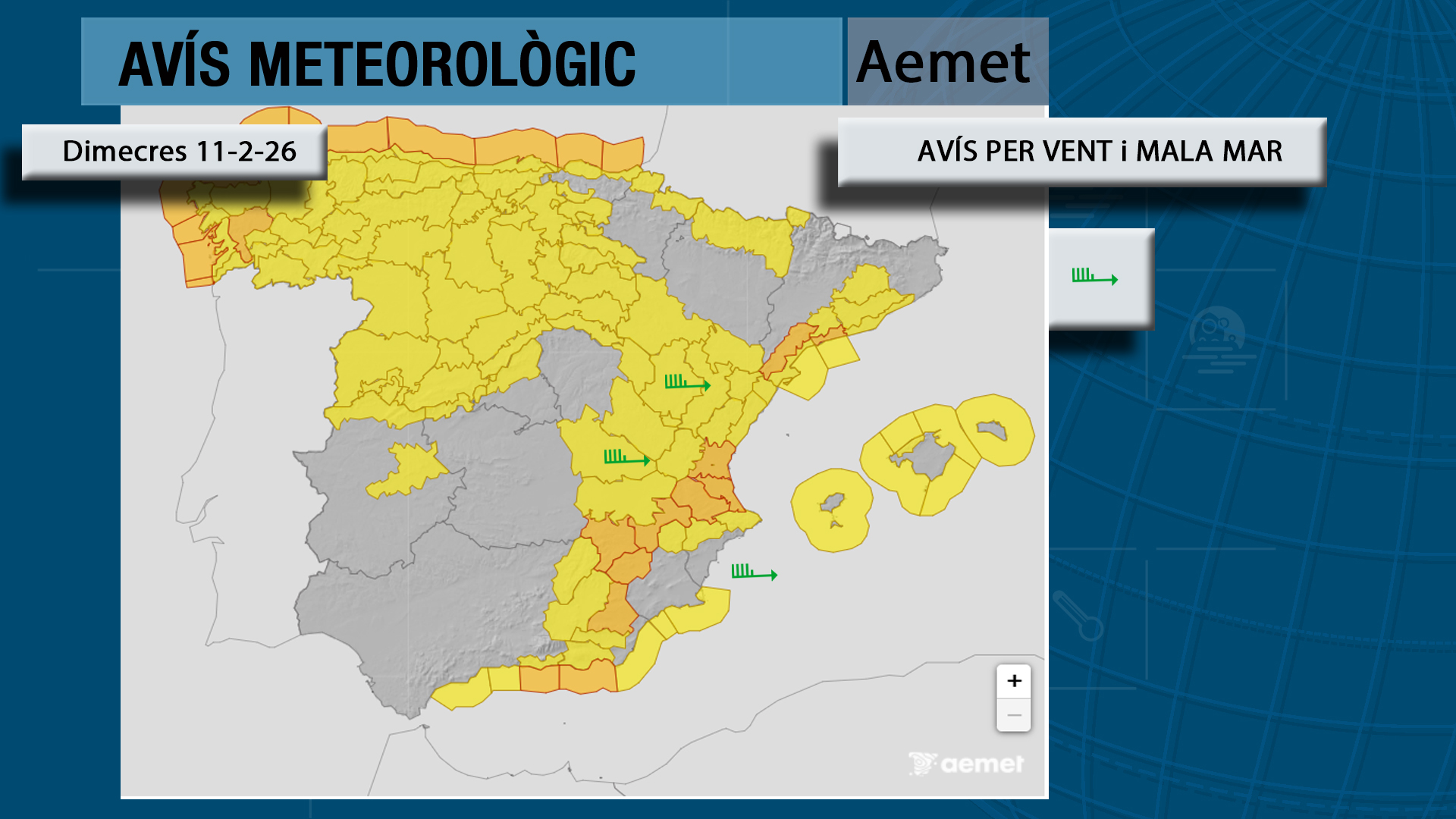 És al centre on es mantenen els avisos taronja per vent fort. El ponent seguirà bufant de manera sostinguda, amb cel variable i possibilitat d’algun ruixat feble a l’interior durant la vesprada. Les mínimes han sigut inusualment altes, però les màximes baixaran lleugerament, quedant el dia calorós però no tant com el d’ahir. Demà els avisos es mantindran fins a mitja vesprada, amb alternança de núvols i clars i temperatures en lleuger descens.
