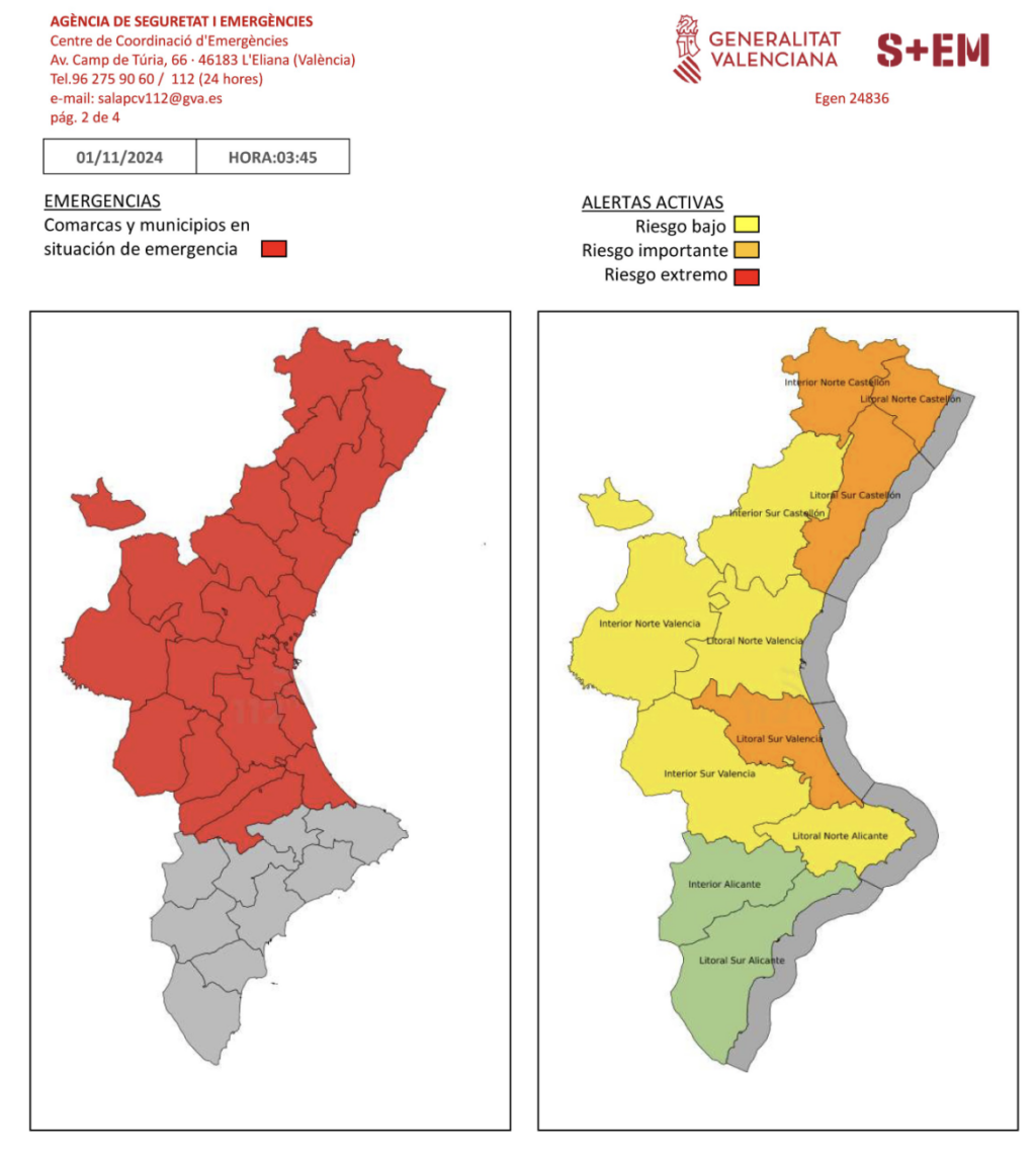 L’Emergència situació 2 del Pla d’Inundacions es manté activa en totes aquestes comarques. Segons Emergències, a la Safor s’observen acumulacions de 52 litres per metre quadrat a causa d’una cèl·lula convectiva estàtica sobre el terç sud de la zona d’avís, i s’espera que es continuen acumulant quantitats importants en les primeres hores del dia.