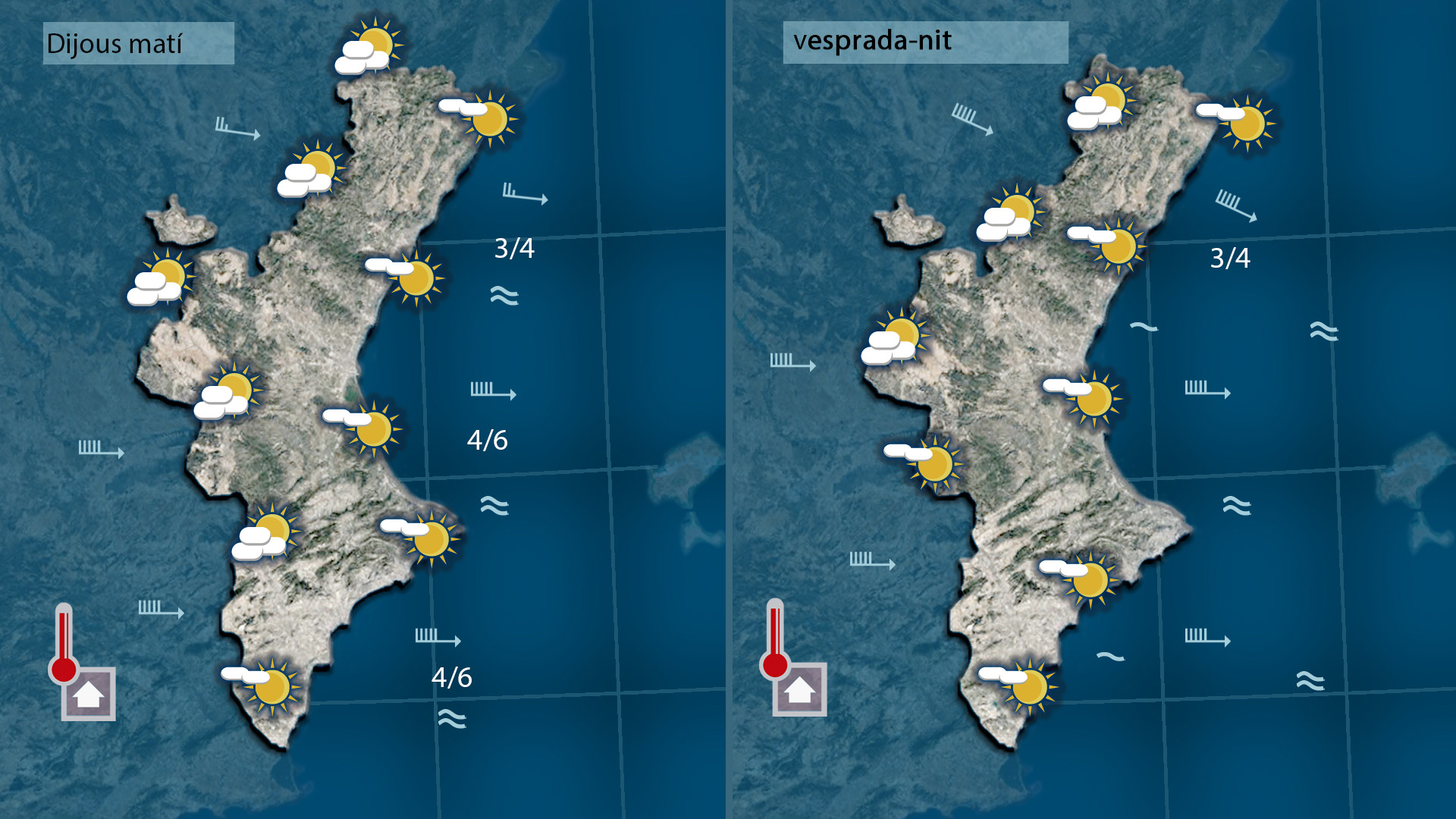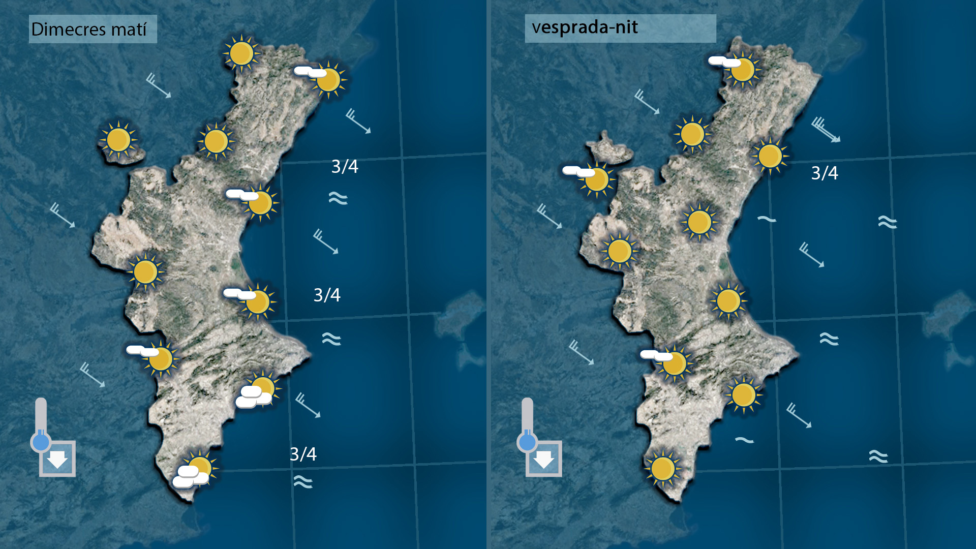 El vent també es deixarà sentir, tot i que amb menys intensitat que al nord. Hui predominarà un ambient clar i fresc. Demà serà protagonista el ponent, amb ratxes fortes a les zones més interiors, especialment la Vall d’Albaida. A partir de divendres les temperatures pujaran i el cap de setmana serà notablement suau.