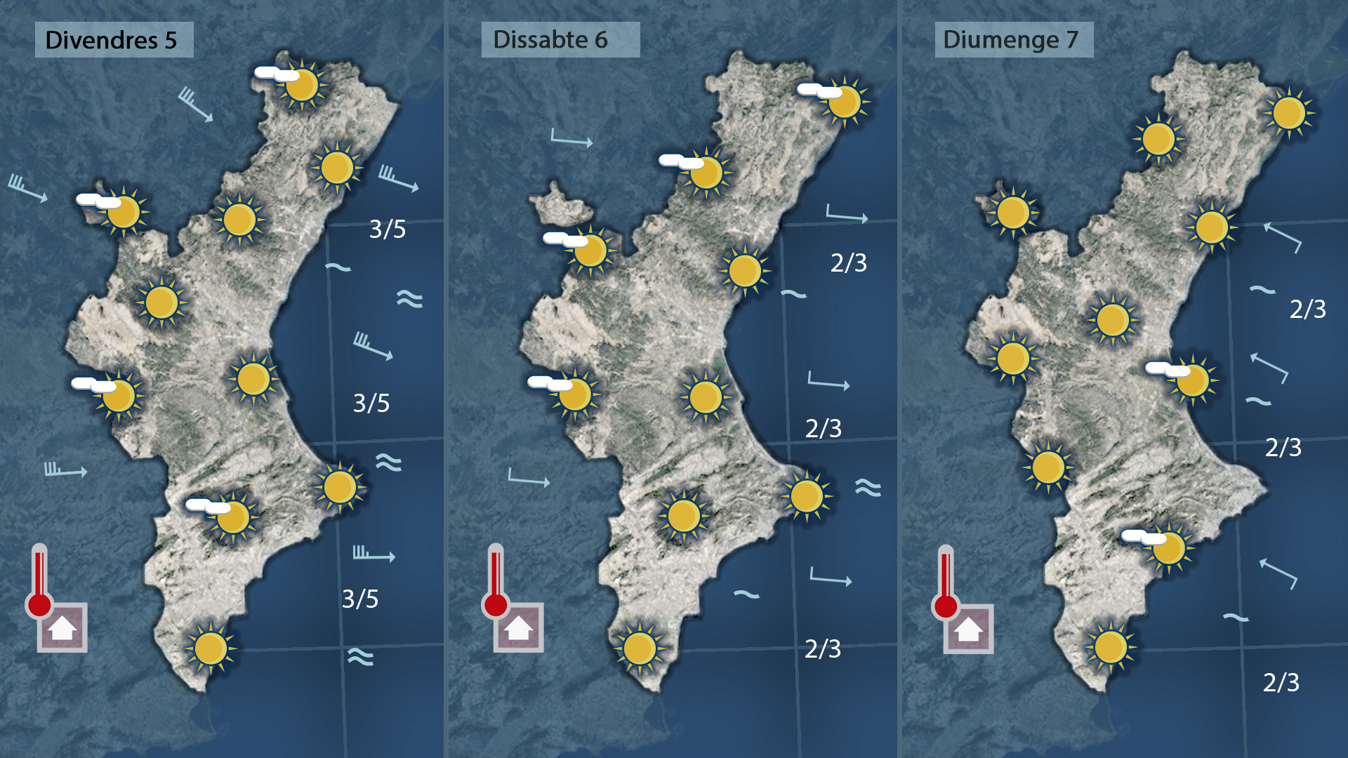 Divendres ja notarem clarament el canvi: menys vent, més sol i una pujada de temperatures que es mantindrà dissabte i diumenge. Els models apunten a un cap de setmana amb valors molt suaus per a l’època, incloent-hi nits més temperades i migdies que convidaran a eixir al carrer.
