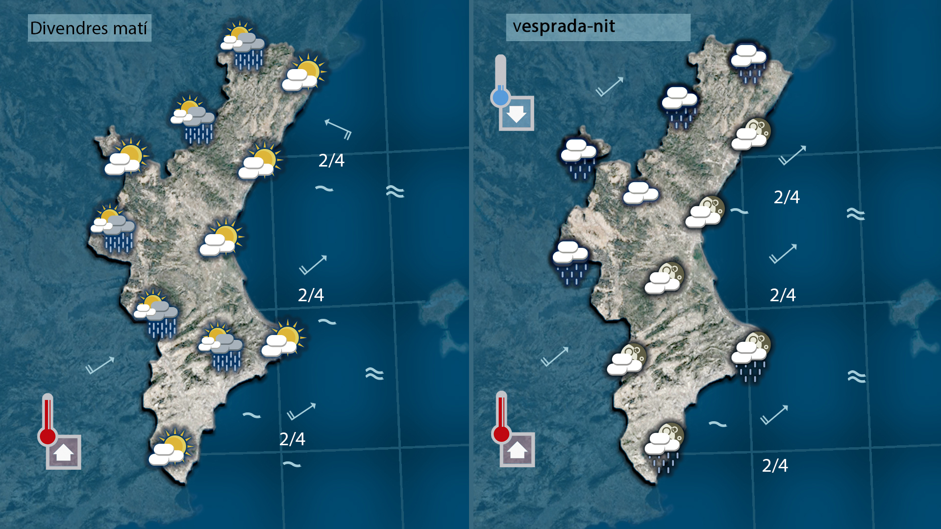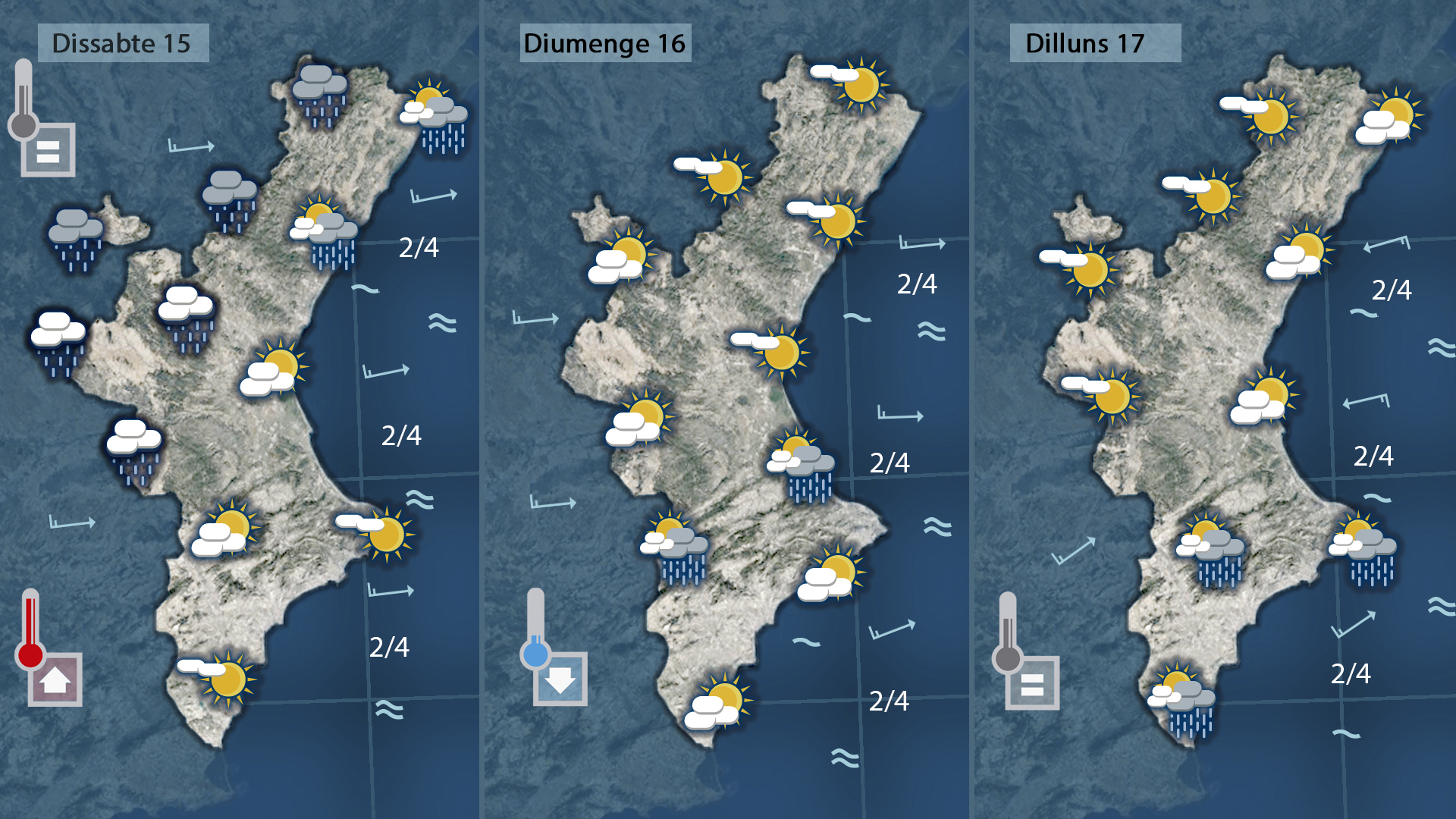 Fins divendres, el xaloc i el llebeig mantindran un oratge humit, suau i sense pluges importants. El cap de setmana, el ponent tornarà a bufar i mantindrà les temperatures altes, amb un descens suau diumenge. Dilluns començarem la setmana amb un canvi progressiu de vents: llevant i gregal al nord, mentre al sud encara dominarà el ponent.