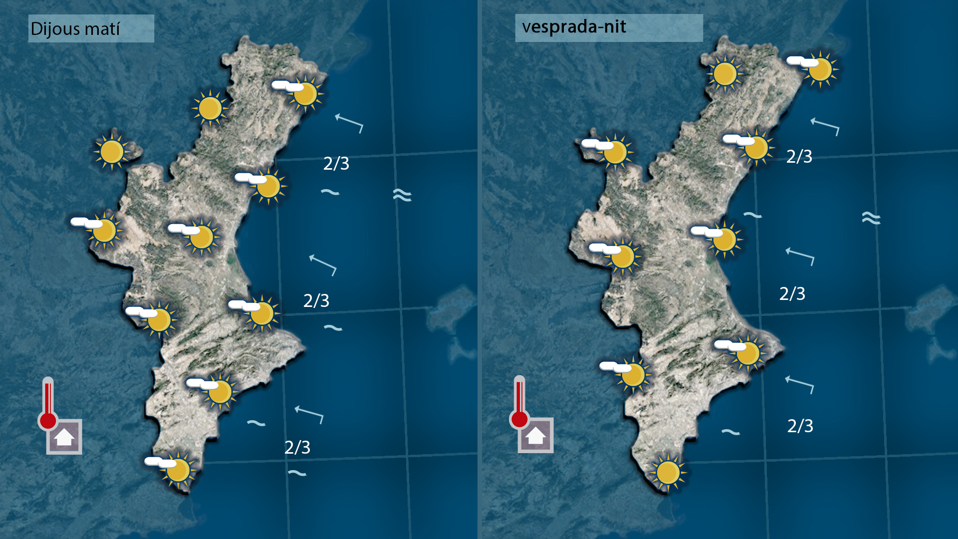 L’ambient serà humit i tèrbol, amb presència de núvols baixos i una sensació càlida que recorda més la primavera que el novembre. Les temperatures es mantindran sense canvis o pujaran lleugerament, amb màximes pròximes als 25 °C a la Ribera i l’Horta. Divendres, el vent de llebeig aportarà més núvols i pot deixar algun plugim a l’interior, però a la costa dominarà el sol i l’ambient càlid. Durant el cap de setmana, el ponent bufarà amb moderació i mantindrà temperatures altes fins diumenge, quan començaran a baixar lleument.