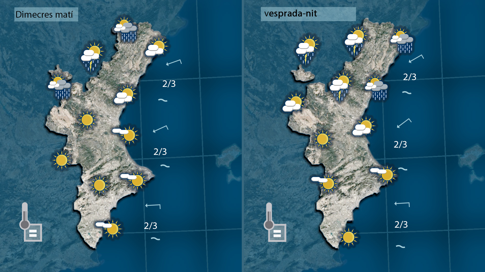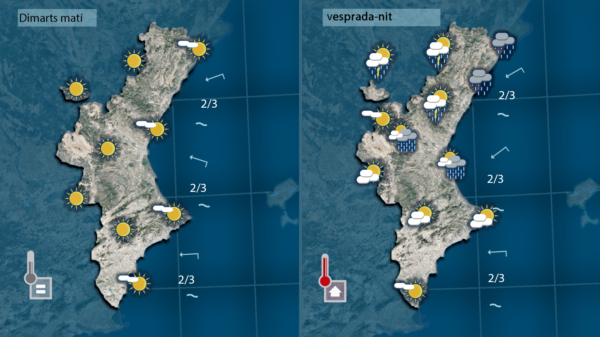 El nord serà la zona més afectada per les tempestes. A partir de primera hora de la vesprada, les nuvolades creixeran amb força i podran descarregar ruixats intensos amb tempesta elèctrica i ratxes de vent sobtades, especialment als Ports, Alt Maestrat i Alt Millars. Les màximes es mantindran al voltant dels 33 °C a l’interior i 30 °C a la Plana, amb un ambient molt xafogós. Dimecres i dijous continuaran les tempestes, que podran ser generals i persistents abans de donar pas a un cap de setmana més estable.