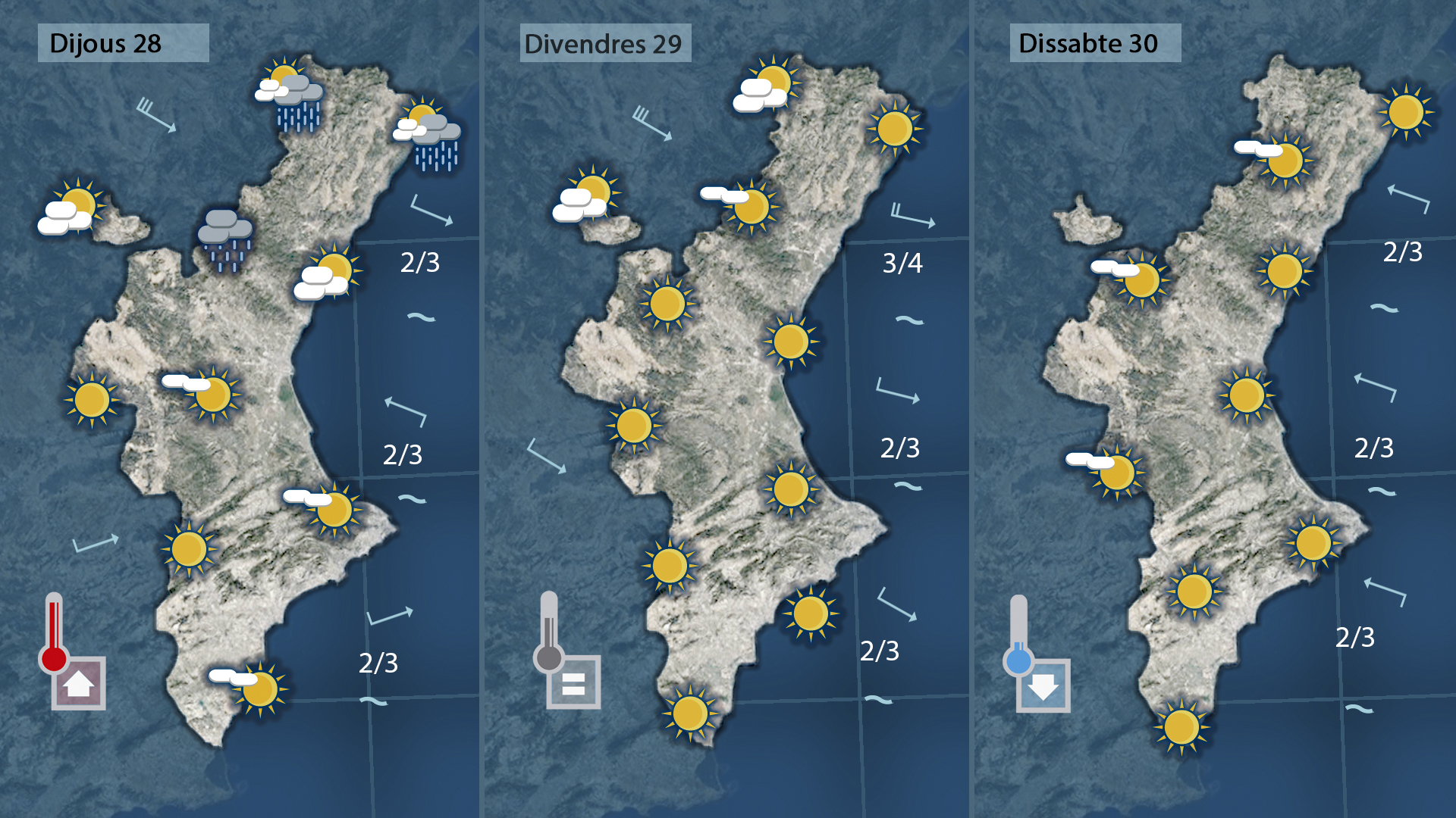 Les pròximes jornades estaran marcades per la persistència de la calor i la retirada gradual de la calitja amb l’arribada del mestral. Les tempestes continuaran sent protagonistes al nord dimecres i dijous, amb nuclis intensos en algunes comarques interiors de la meitat nord del País Valencià. A partir de divendres, l’oratge s’estabilitzarà, el cel guanyarà nitidesa i el cap de setmana es presentarà amb sol i temperatures encara altes però sense la intensitat de dies anteriors.