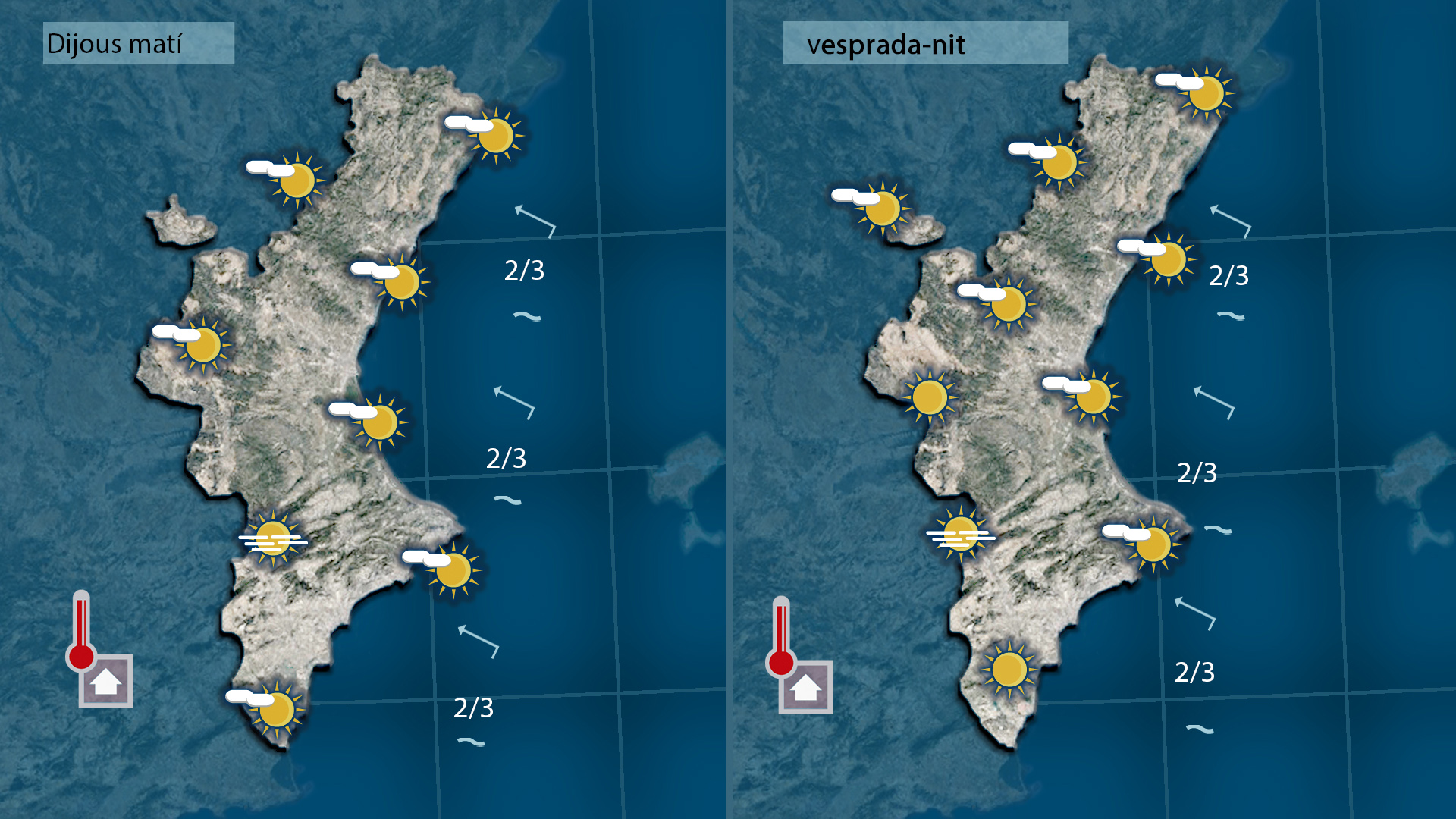 Al nord el cel presentarà intervals de núvols alts, però amb predomini del sol. Les temperatures pujaran i l’ambient serà suau o càlid al migdia. No es descarta alguna gota molt puntual, sense importància.