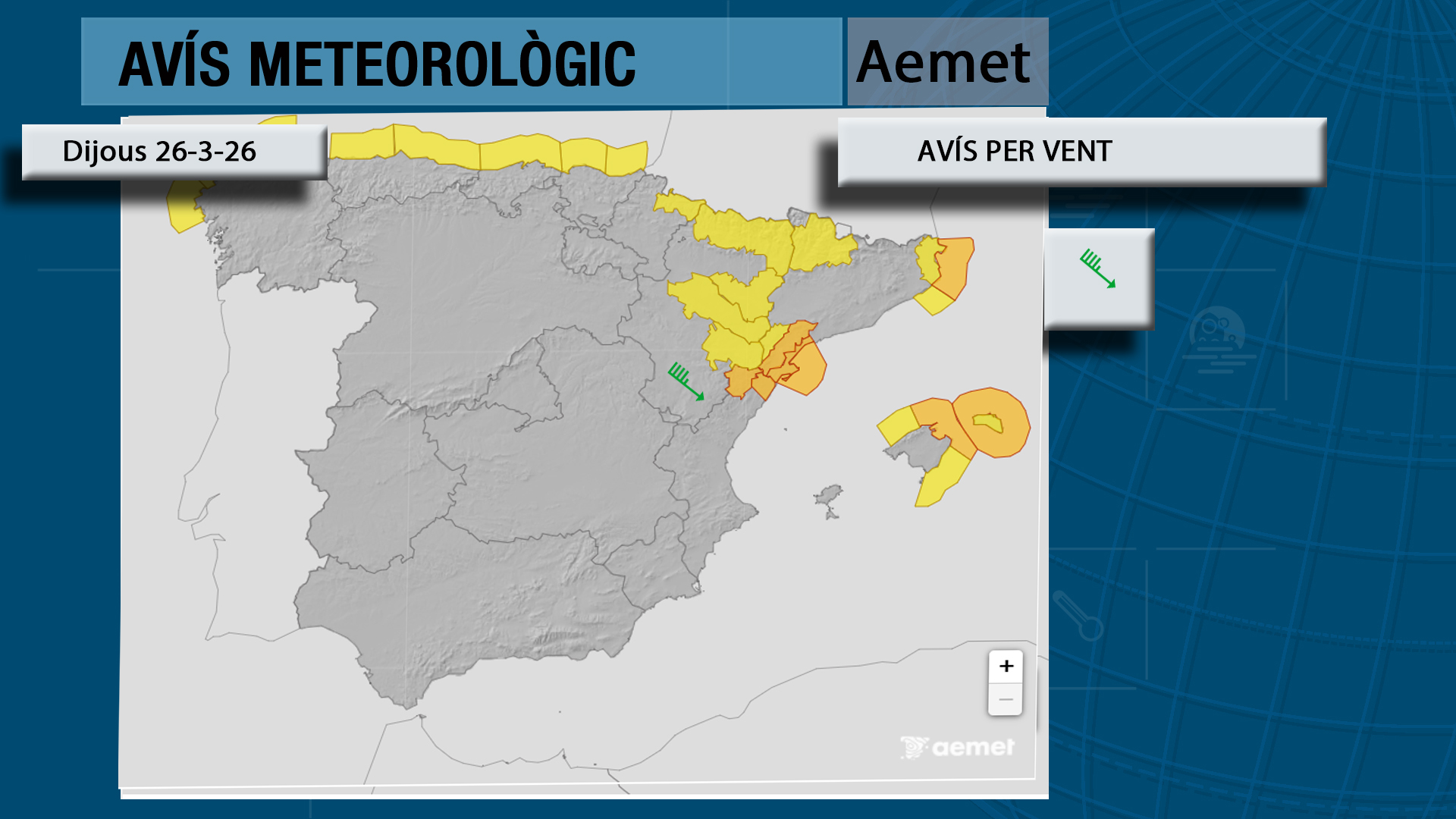 Dijous el mestral bufarà amb força al nord mentre que al sud dominarà el gregal. Este canvi provocarà un augment de la nuvolositat al litoral de la meitat sud i un descens tèrmic general.