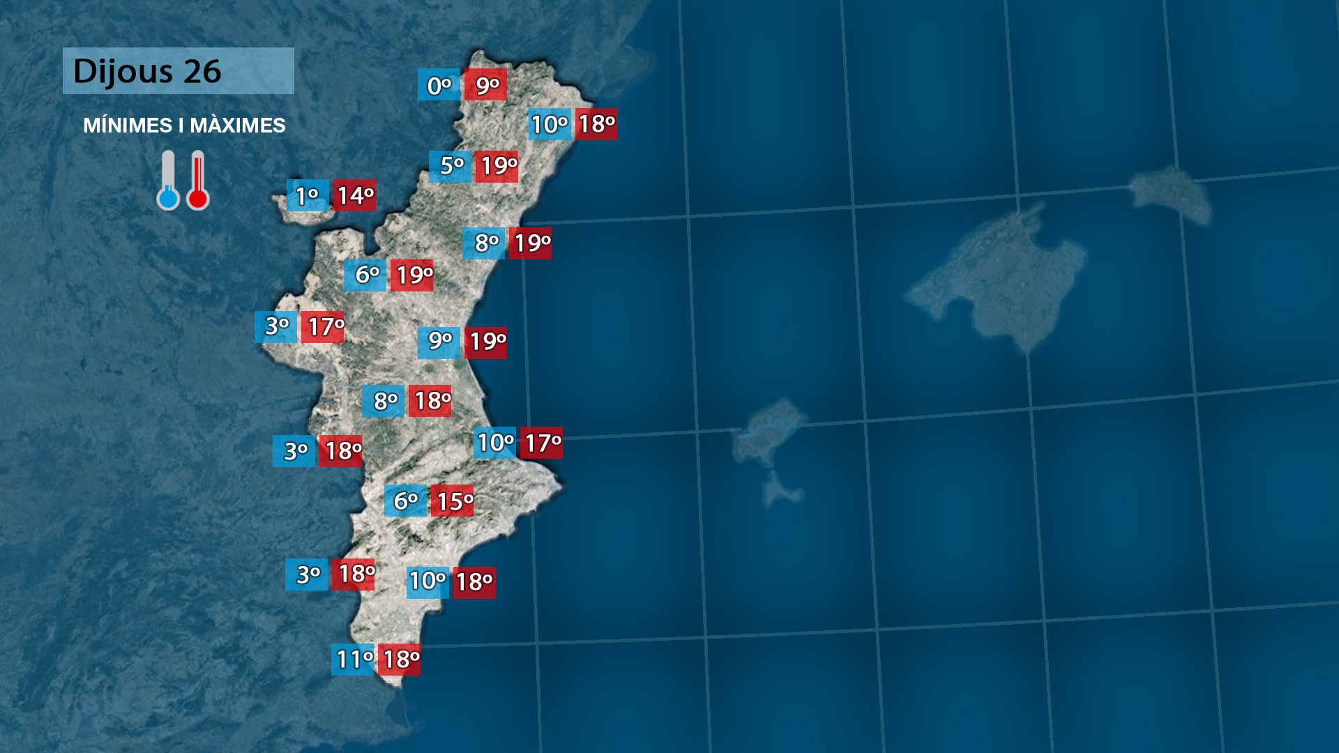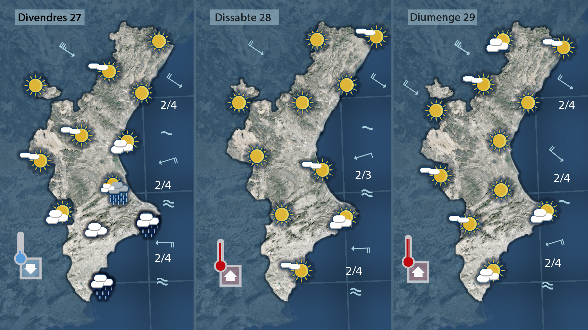Al sud l’ambient serà càlid hui, especialment a la costa, amb màximes pròximes als 25 °C. A partir de demà el vent girarà a gregal, afavorint l’entrada de núvols al litoral i una baixada de temperatures.