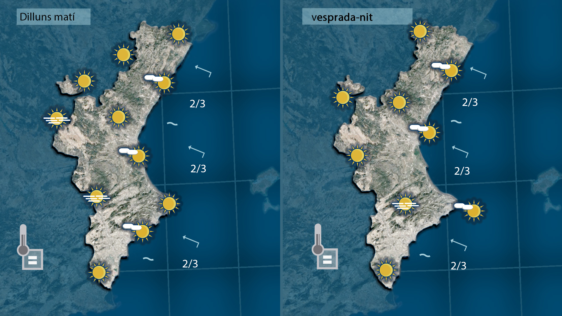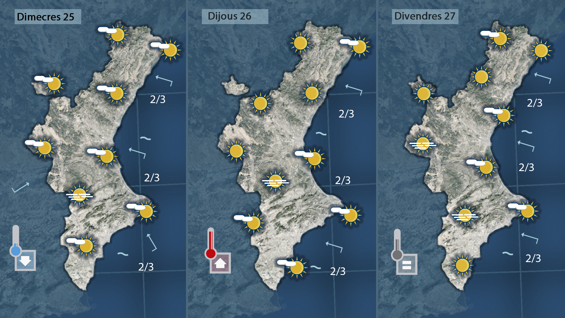Amb el vent encalmat o fluix de sud-est, procedent de la mar, les nits són més fresques mentre que de dia els termòmetres pugen més a l’interior i al centre que no a la costa. A més, la mateixa situació anticiclònica afavorix inversions tèrmiques i la formació de borines persistents a les zones més fondes.
