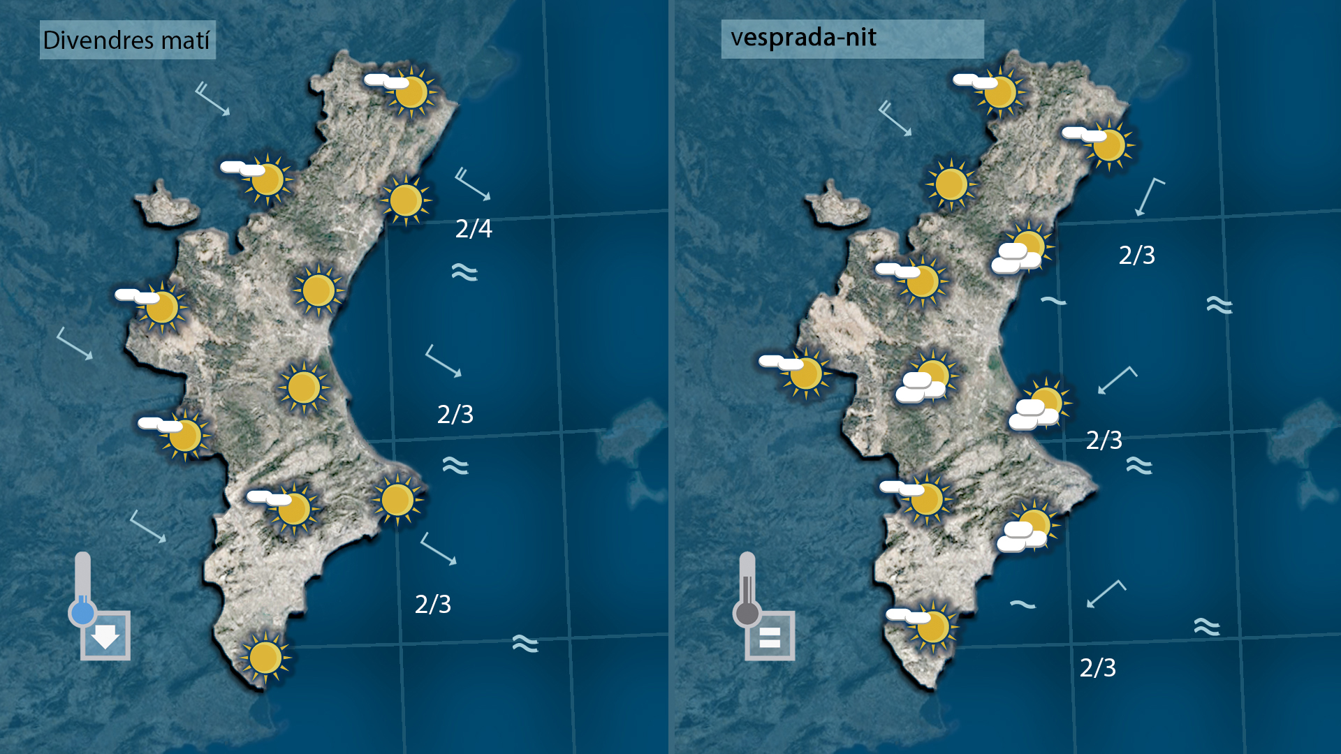 A les comarques centrals, hui el dia serà fresc, amb mestral al matí i gregal a la vesprada, deixant més núvols a la costa. Dissabte, el ponent aportarà un ambient una mica més suau, amb pas de núvols alts. Diumenge, coincidint amb l’entrada oficial de l’hivern, augmentarà la nuvolositat i podran aparéixer plugims a la costa i ruixats dispersos a l’interior. Dilluns el vent tornarà a bufar amb força, deixant un matí fred i una vesprada més estable.