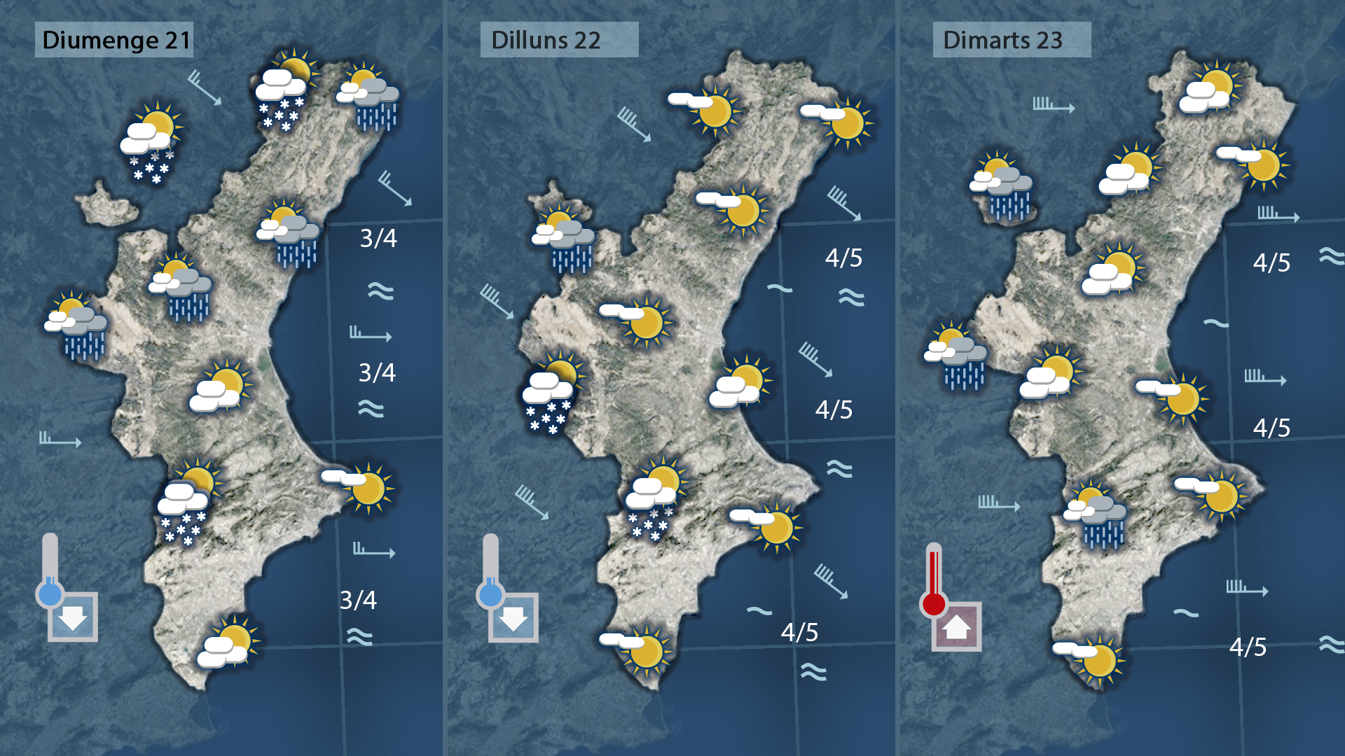 El nord serà la zona més freda estos dies. Hui el mestral bufarà amb ganes i deixarà un ambient hivernal, sobretot a l’interior i a les zones de muntanya. Dissabte, amb el gir a ponent, passaran núvols sense massa conseqüències, però diumenge el cel tornarà a carregar-se i no es descarten ruixats febles a l’interior. Dilluns el mestral es reforçarà de nou, amb ambient molt fred a primera hora i possibilitat d’alguna enfarinada a les muntanyes més altes.