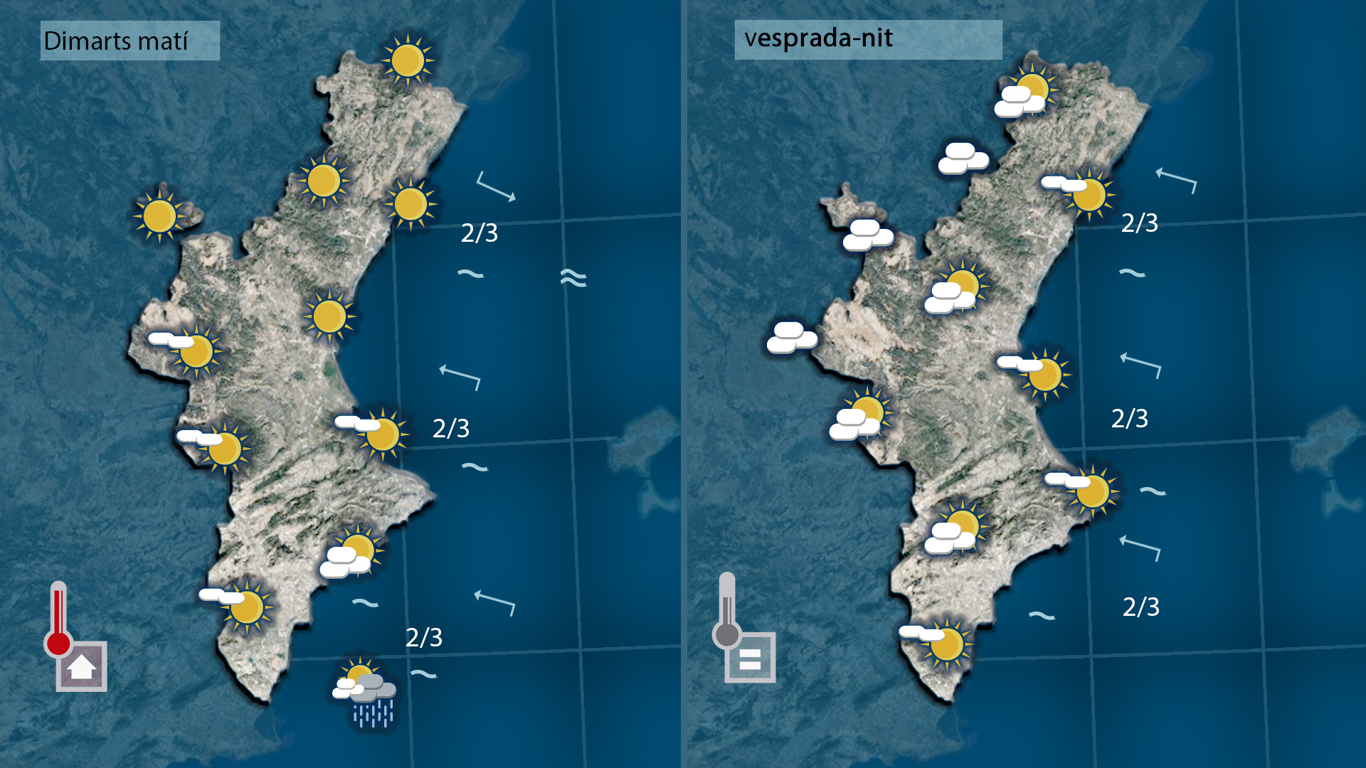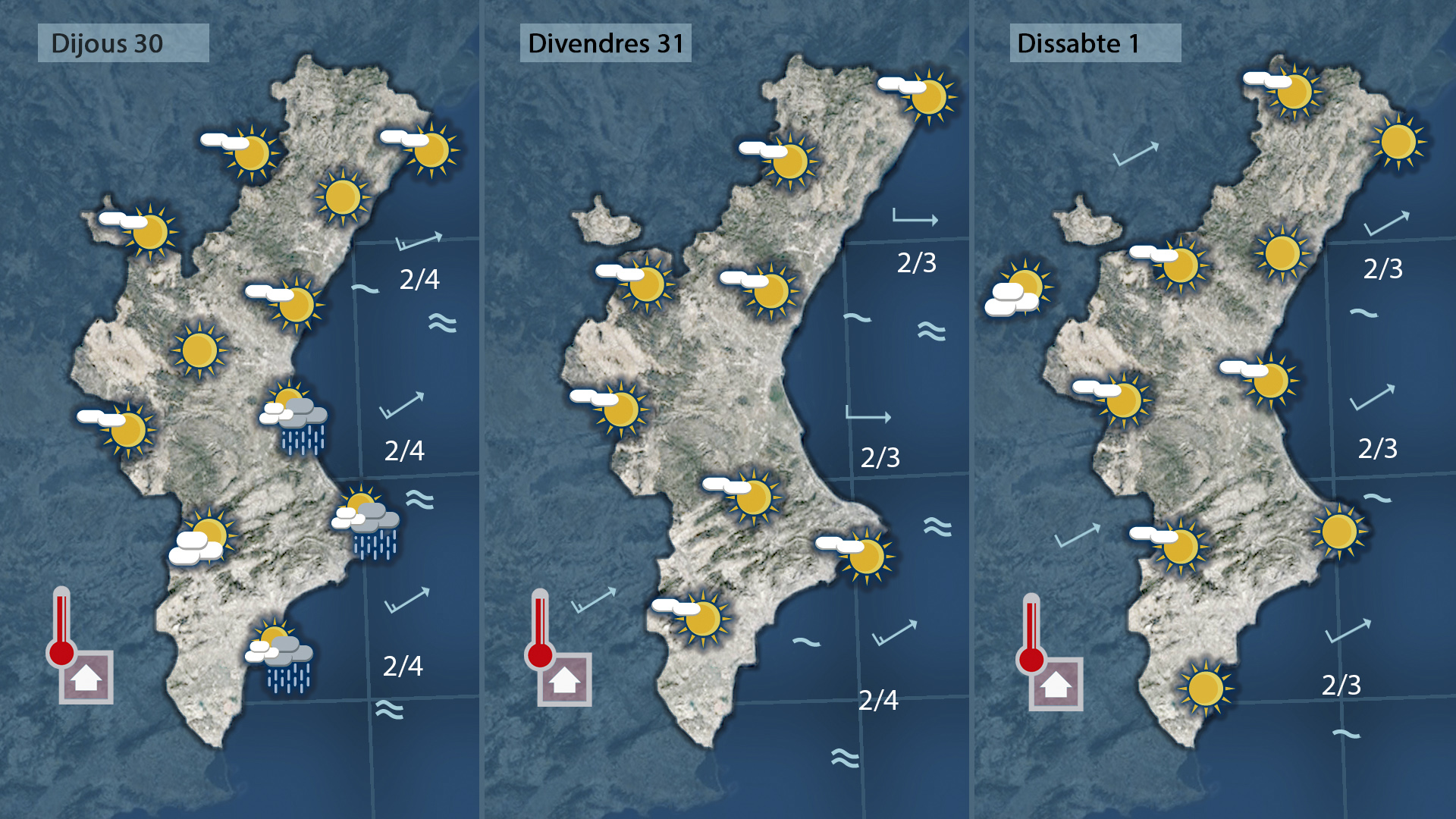 Setmana variable i sense fred. Hui dimarts tindrem un dia agradable amb cel clar i un augment de la nuvolositat a últimes hores. Dimecres serà el dia més gris de la setmana, amb ruixats febles que avançaran d’oest a est i afectaran puntualment l’Horta i la Ribera. Les temperatures es mantindran suaus de nit i pujaran lleugerament de dia. A partir de dijous el sol tornarà a dominar i les màximes podran superar els 25 °C, amb ambient primaveral per a Tots Sants.