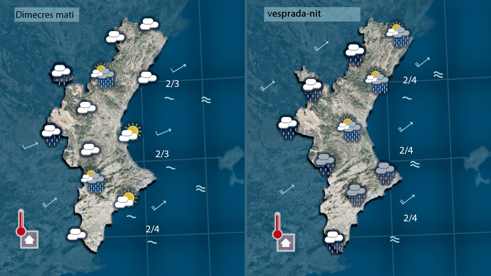 La jornada de hui serà majoritàriament assolellada, amb un augment progressiu dels núvols a partir del vespre. Demà dimecres el cel es presentarà cobert, amb la possibilitat de plugims febles, sobretot a l’interior del Maestrat i l’Alt Palància. Tot i la presència de núvols, les temperatures pujaran lleugerament i el vent de llebeig mantindrà un ambient suau. De cara al cap de setmana, es preveu més sol i màximes que tornaran a acostar-se als 25 °C.