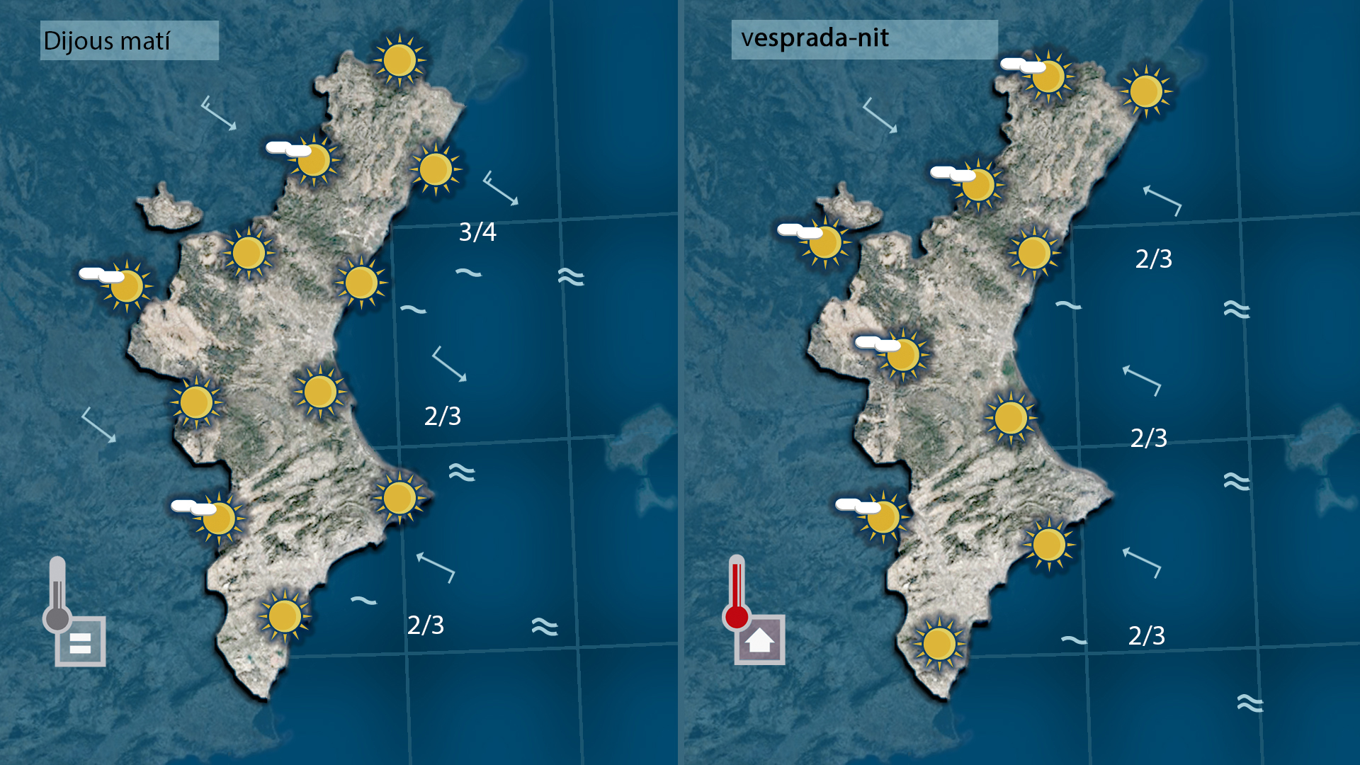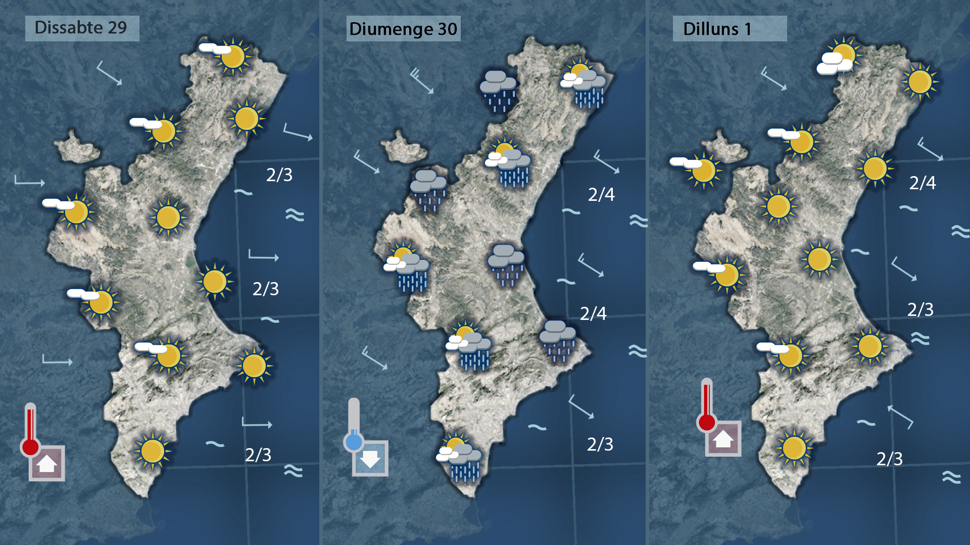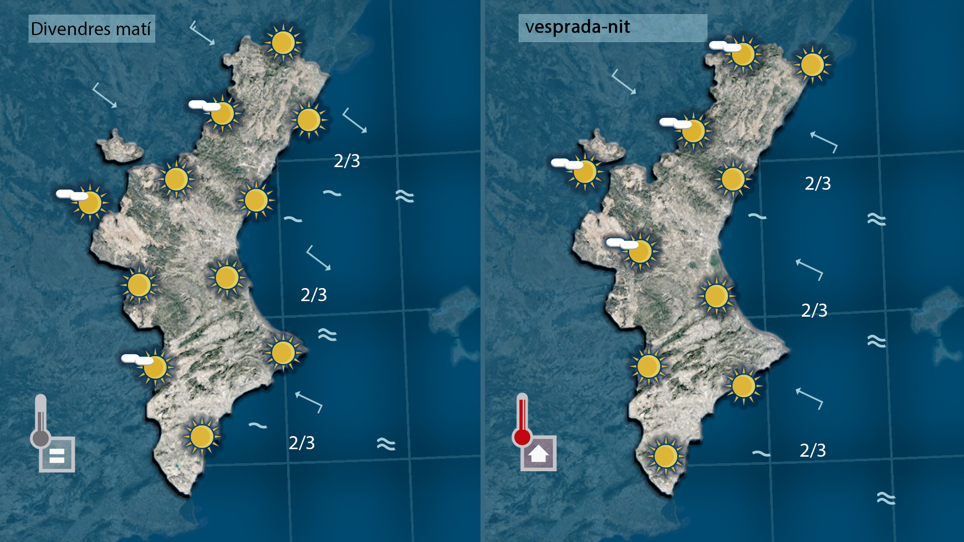 El sud notarà amb més claredat l’encalmada del vent. La nit ha sigut fresca, però el cel clar i el vent fluix permetran una recuperació tèrmica al migdia. Demà les temperatures continuaran pujant i dissabte podria arribar-se de nou als 20 °C en punts de la costa. Diumenge arribarà el canvi amb més núvols, algun plugim molt feble i un descens de les temperatures, tot i que l’ambient continuarà sent moderadament suau per a l’època.