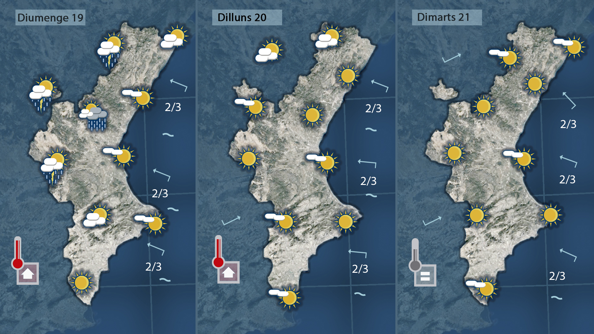 Diumenge, després d’un dia calorós, podrien aparéixer tronades de vesprada a les muntanyes del nord i interior, que podrien fer baixar lleugerament les temperatures en eixes zones.