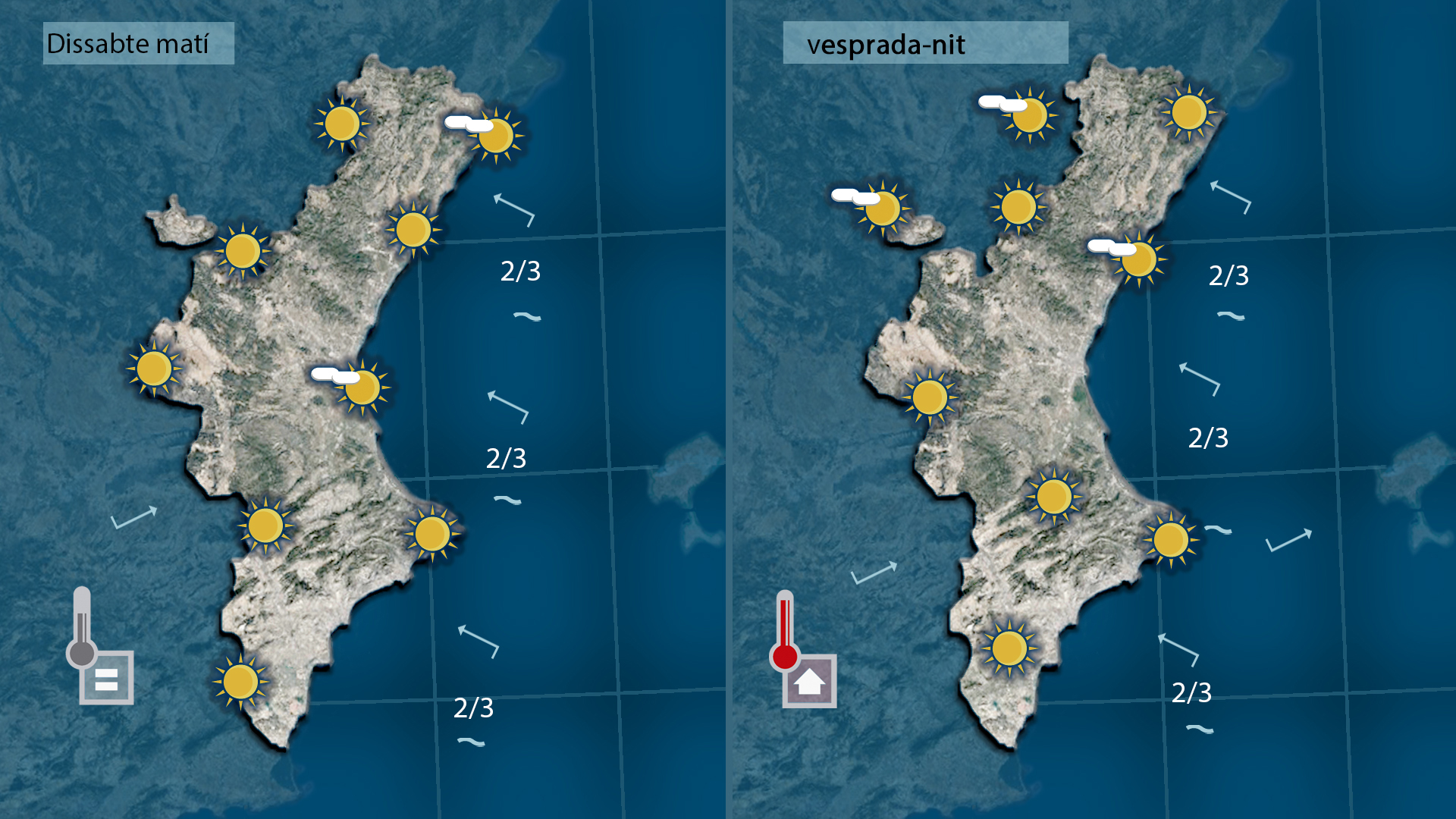 L’oratge de hui divendres és una continuïtat dels últims dies: estabilitat, sol i temperatures lleugerament més altes, amb només alguns núvols baixos puntuals a la costa i alguna boira de poca durada.